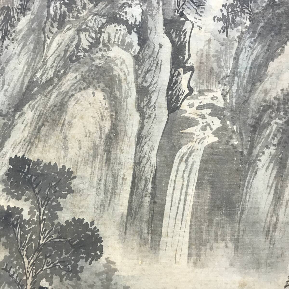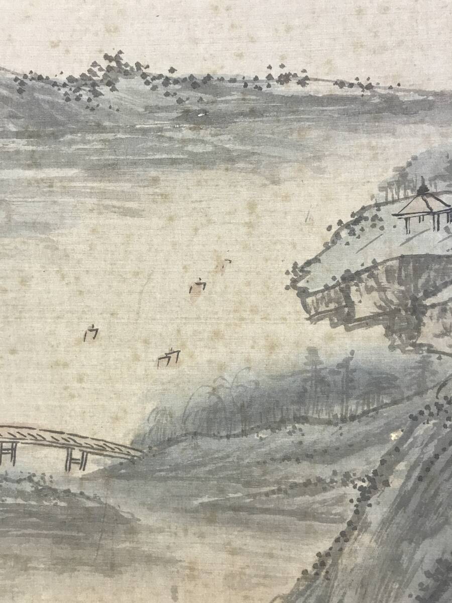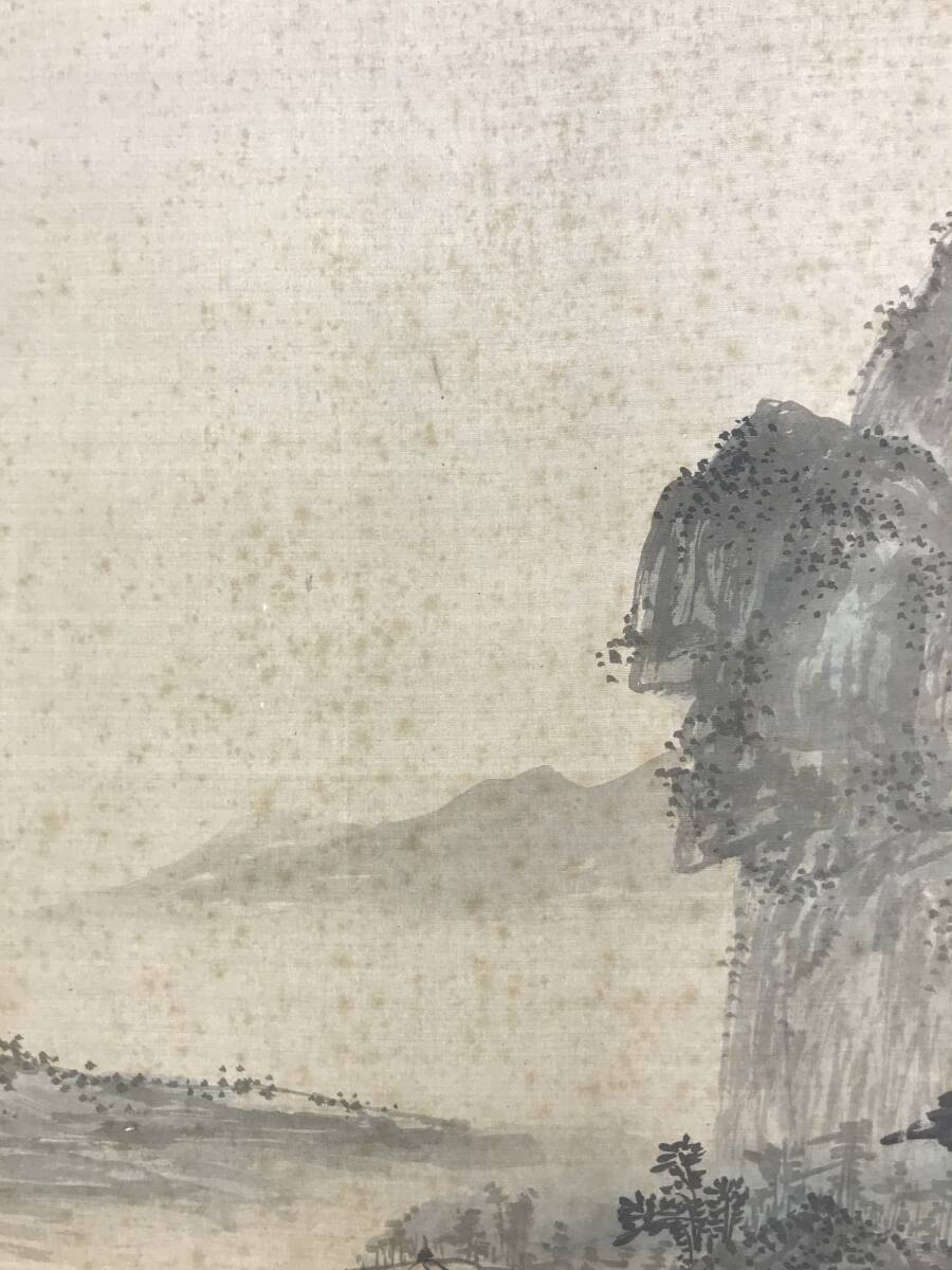 【作品状態】 本紙は絹本です。本紙は時代感あり、全体に多数の糊シミあります。表装は薄汚れ、多少の時代スレあります。