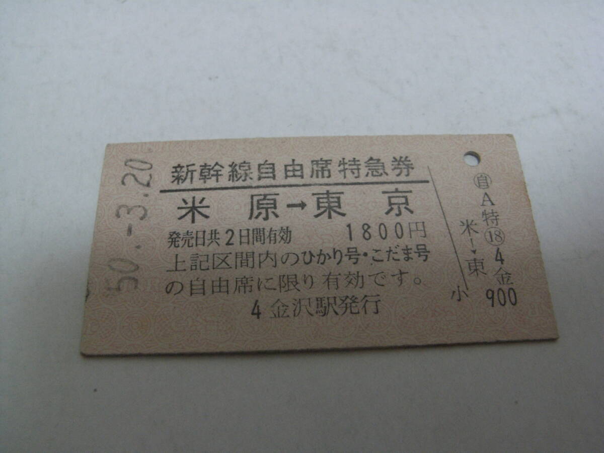 新幹線自由席特急券 米原→東京 昭和50年3月20日 金沢駅発行 国鉄