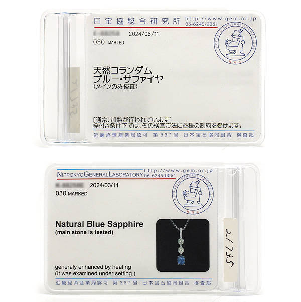 ソーティング記載 | 天然コランダム ブルー・サファイヤ (メインのみ検査) 通常、加熱が行われています |