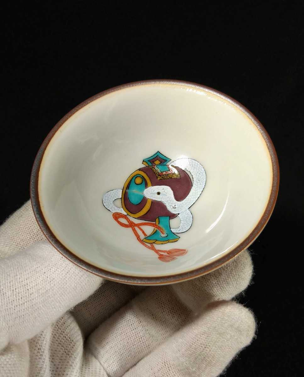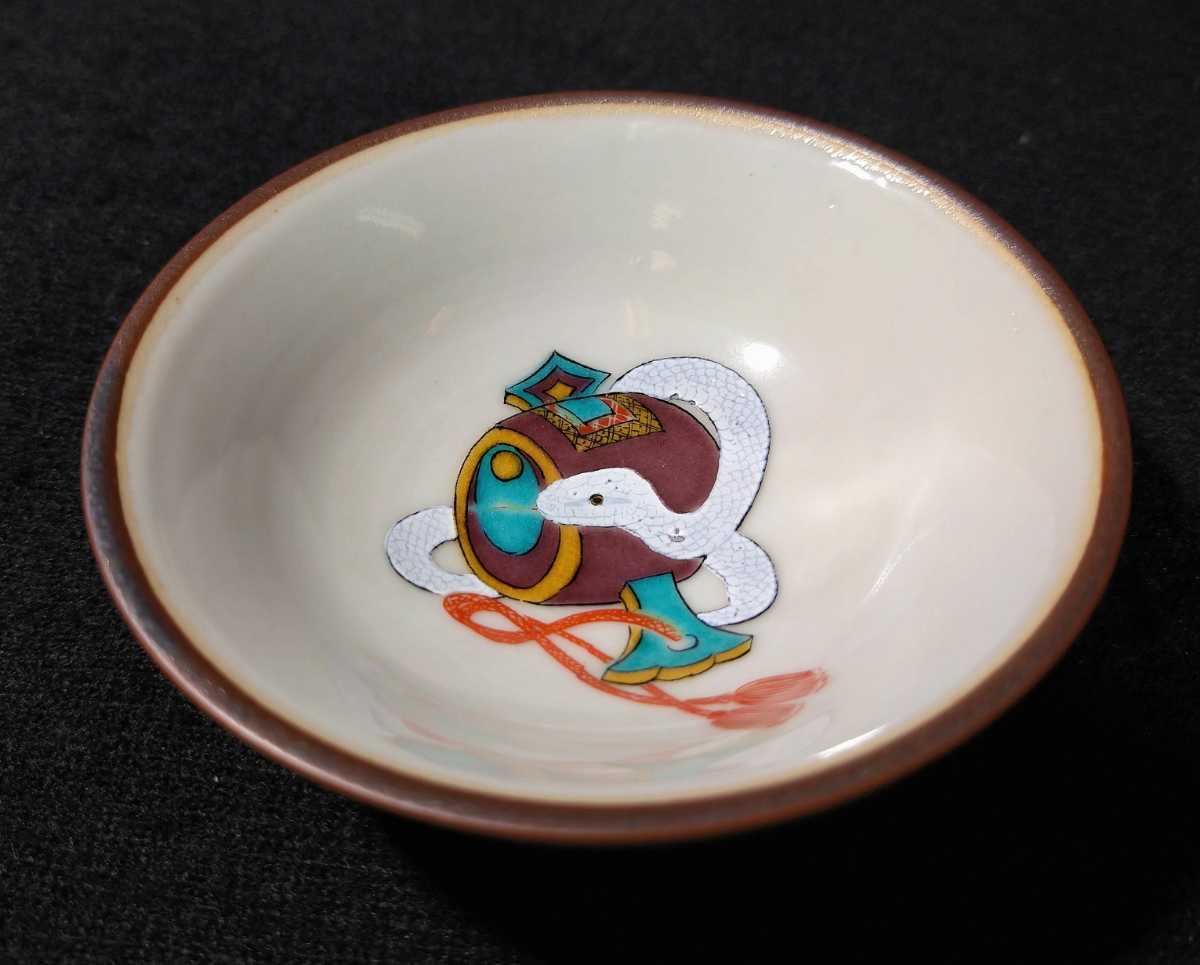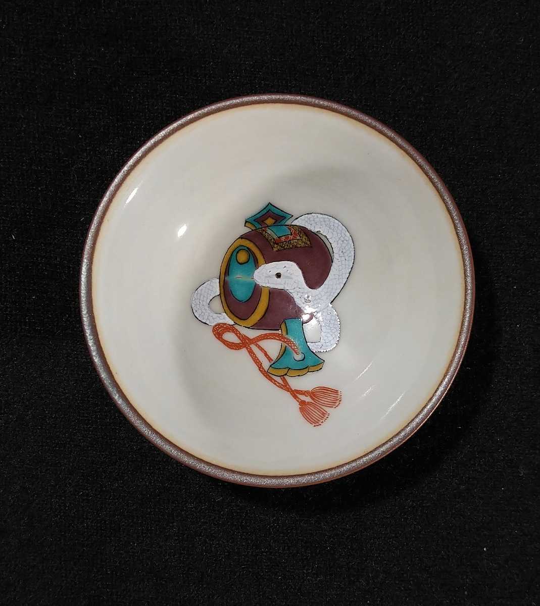 小槌に絡みつく白蛇を描いた縁起物の酒器でございます。素人採寸で申し訳ございませんが、径7.4cm、高さ2.8cmでございます。
