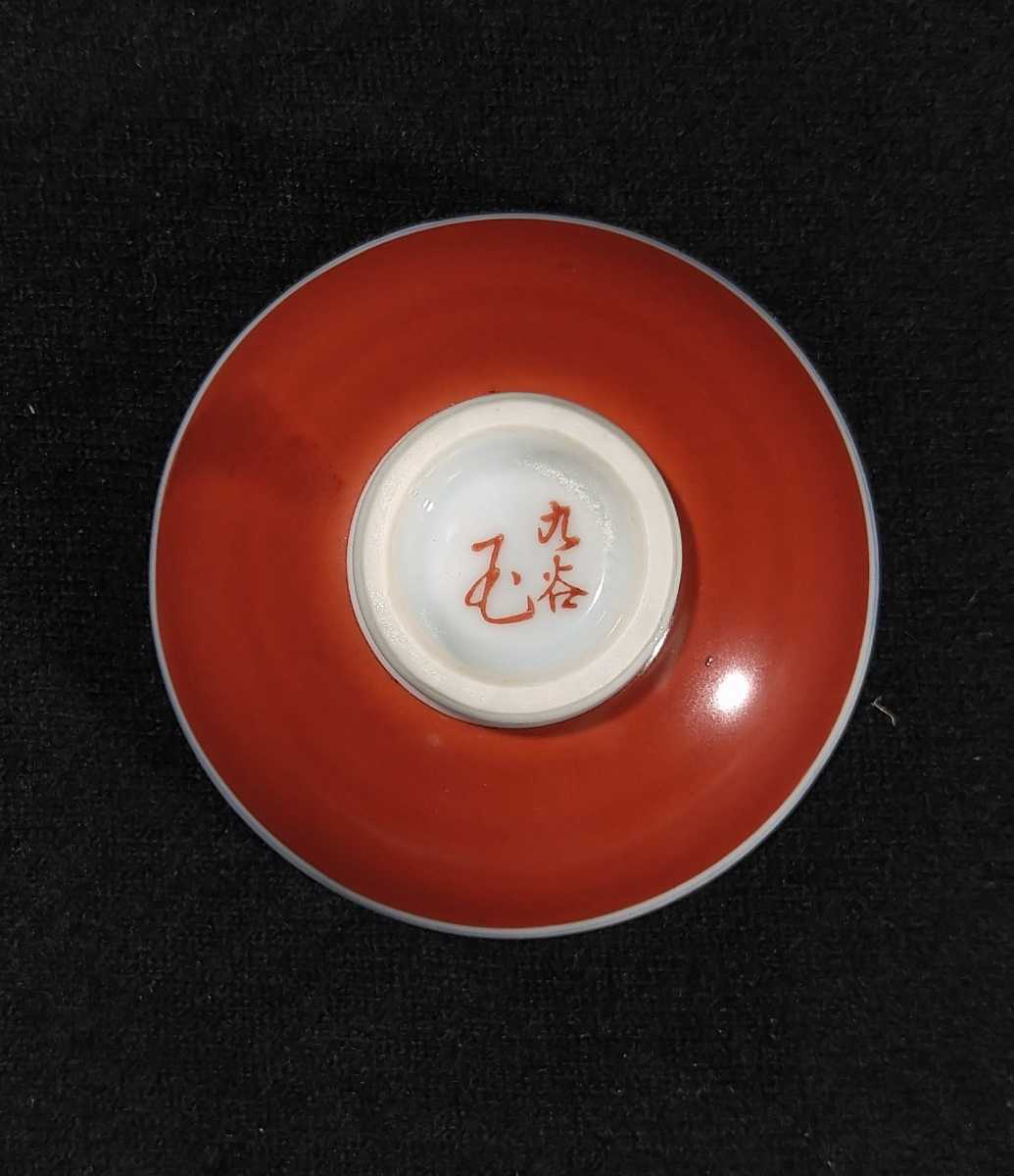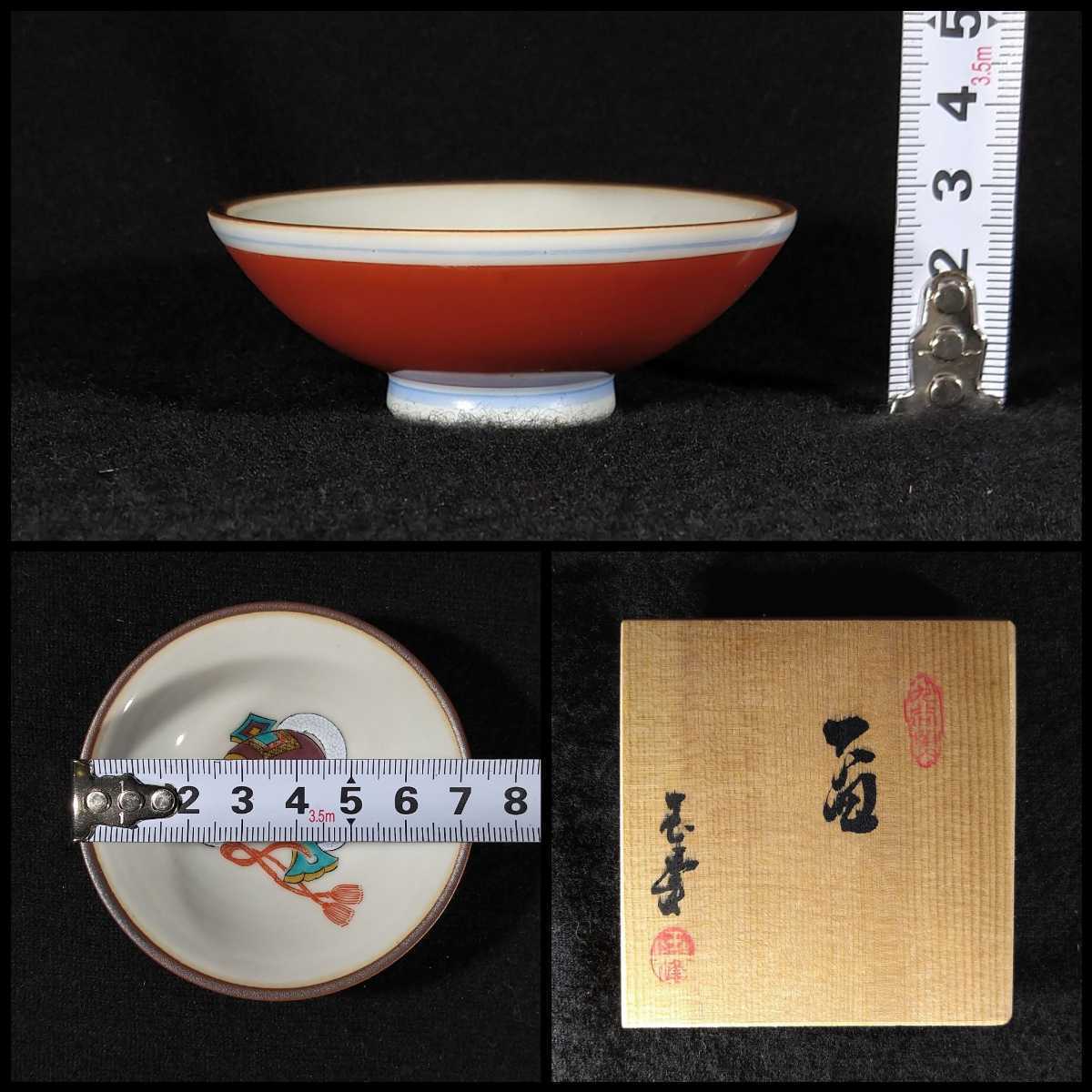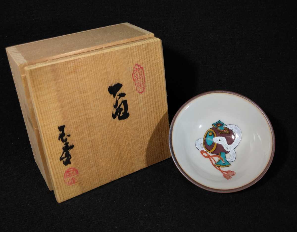 小槌に絡みつく白蛇を描いた縁起物の酒器でございます。素人採寸で申し訳ございませんが、径7.4cm、高さ2.8cmでございます。