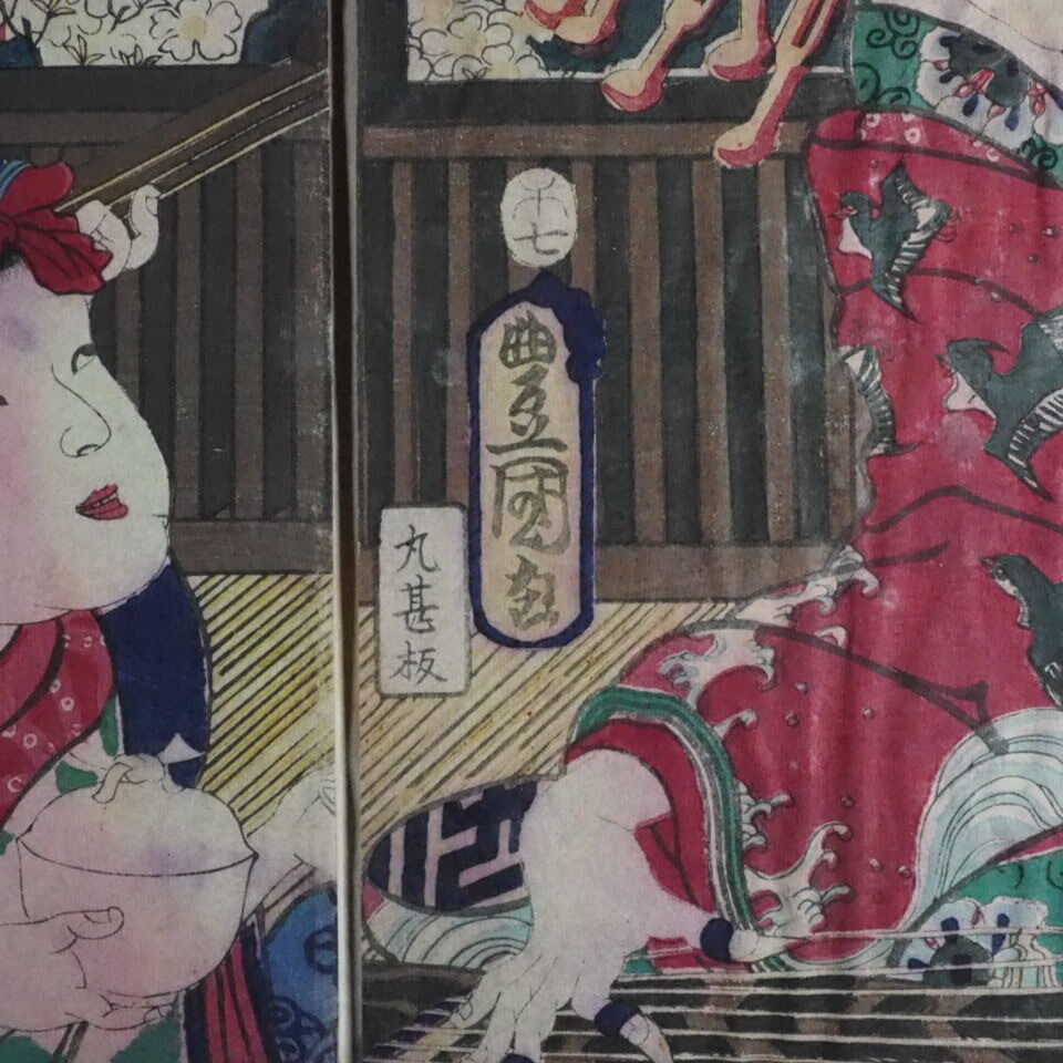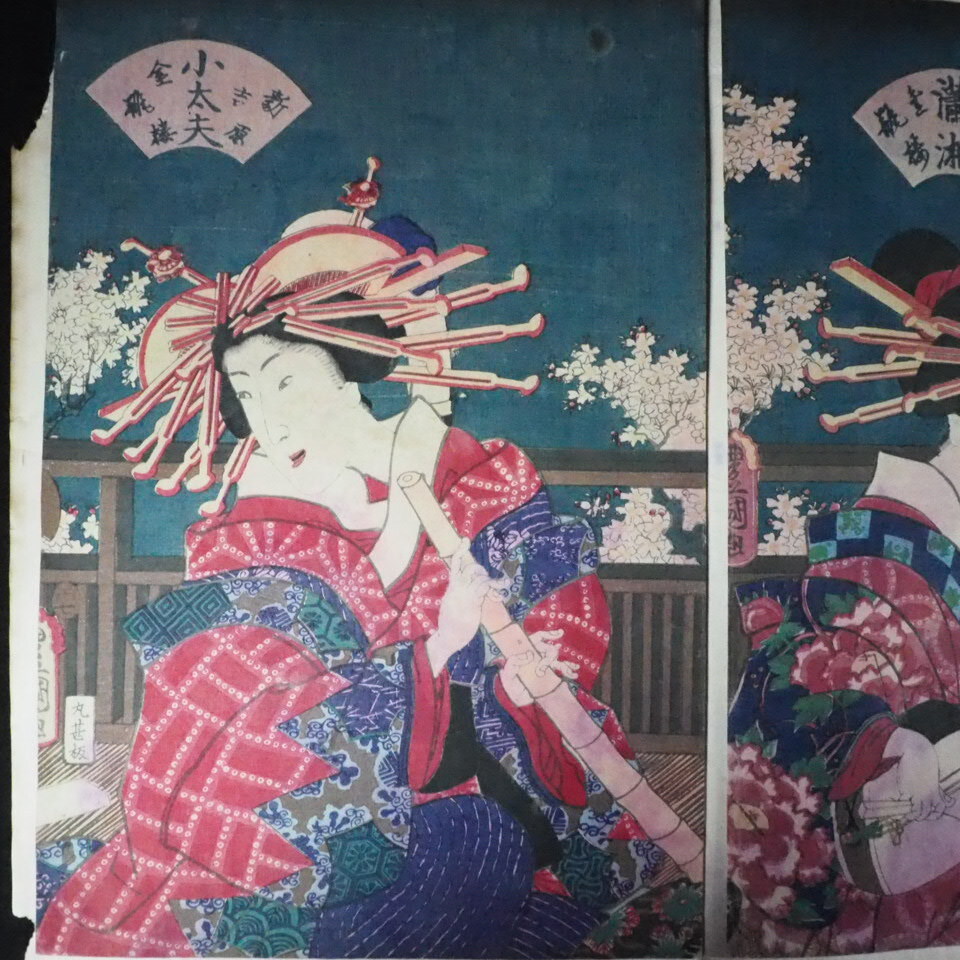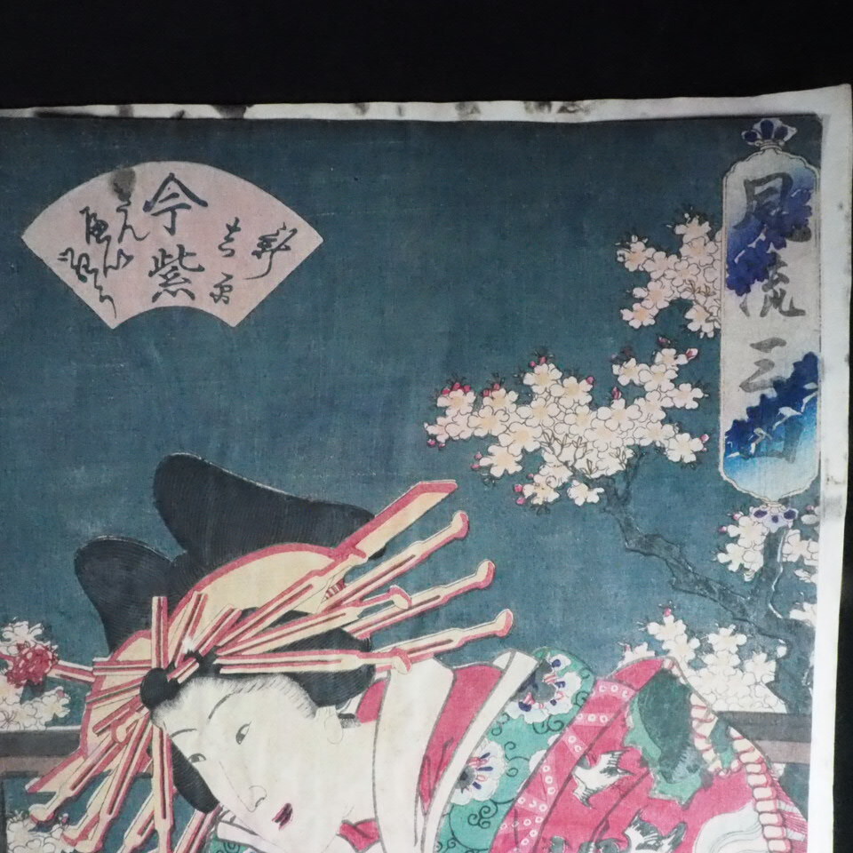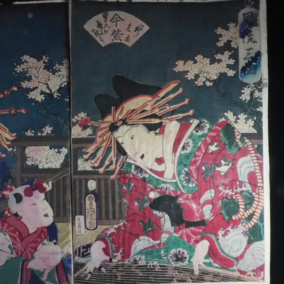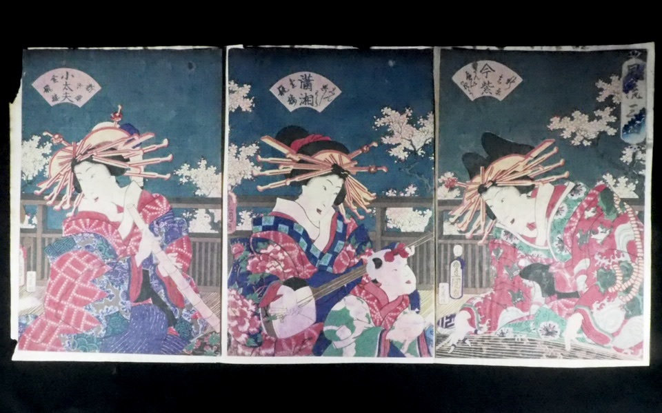 美人画 浮世絵木版画 錦絵 三代目 歌川豊国「 風流三曲 」3枚綴り SMN604(19-7)