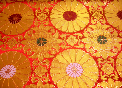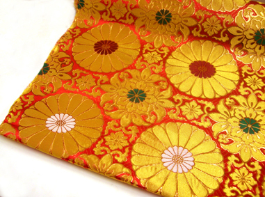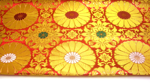 ●朱赤地に白色・赤色と金色の16弁二重菊花と緑色の花芯の唐花や唐草文様を金色で織り込んだ、高貴で重厚な金襴です