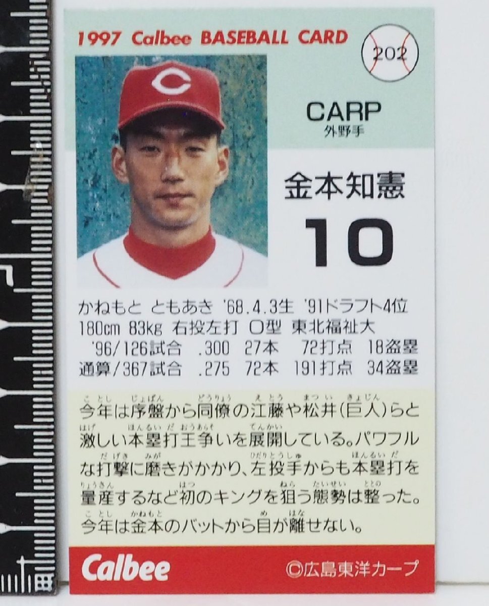 97年 カルビー プロ野球カード 202【金本 知憲 外野手 広島東洋カープ】平成9年 1997年 当時物 Calbeeおまけ食玩BASEBALL【中古】送料込