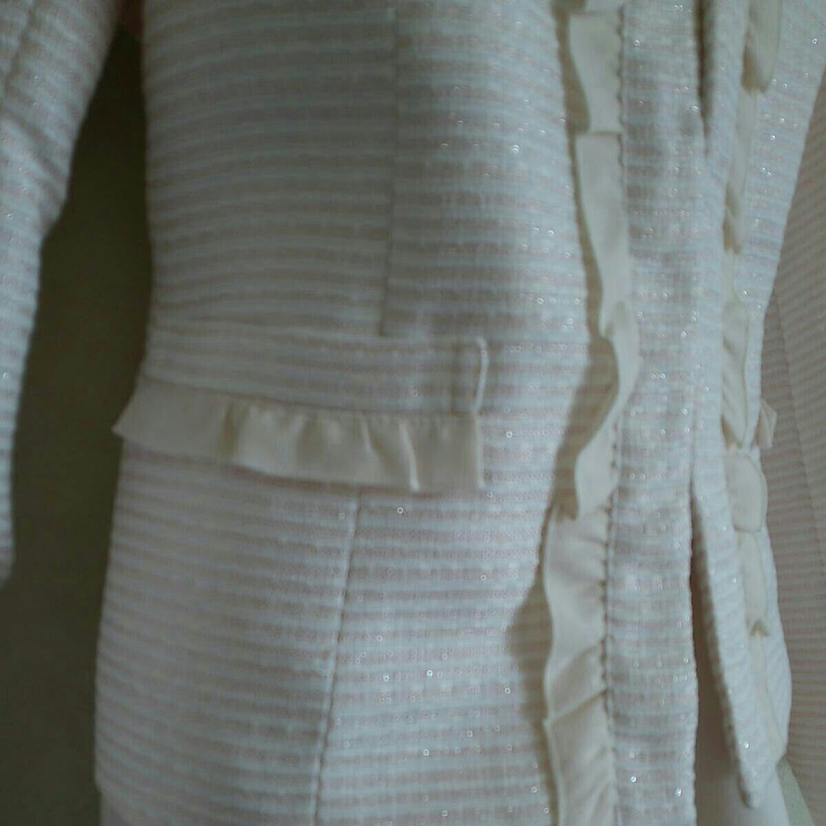 ノーカラースーツ2点セットになります。ラメ感があり高級感があり素敵なスーツです。キャミを着て前を開いて着ていただけます。閉店処分で大変お安く出品しております。スーツはとてもしっかりしています。サイズは19号です。バスト100、ヒップ105、ウエスト84、スカート丈63センチです。入学式・結婚式・オフィスでも幅広く活躍できると思います。