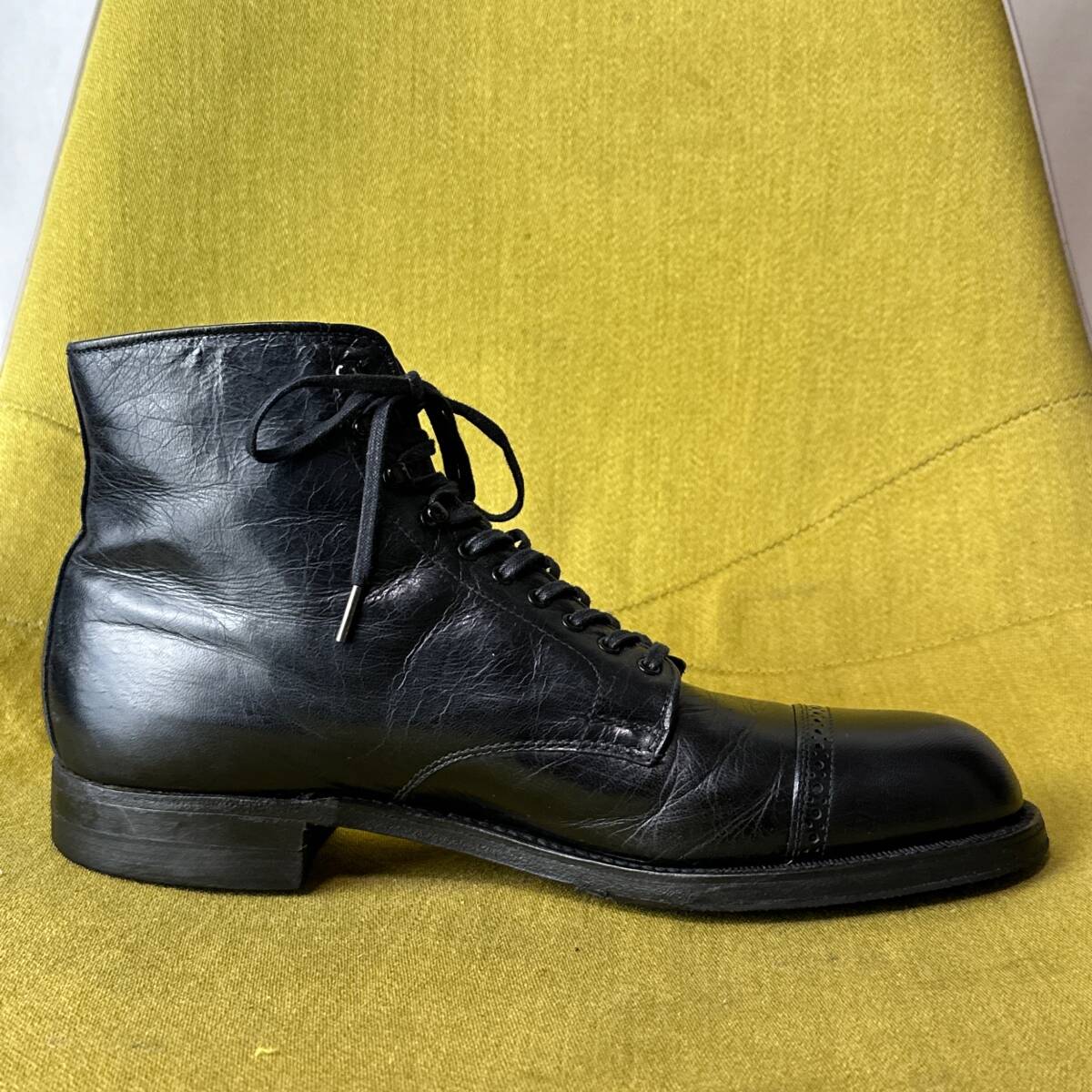 | 少し使用感がありますが、しっかり手入れしてありまだまだ履くことが出来ます。 アッパーは、キッドスキンもしくは、カンガルーになります。所有している別の物と比べると一番キッドスキンに近いです。 アッパーに皺はありますが、乾燥はなく、しなやかで、クラックの恐れは現状ございません。 ブロックヒールより、1950年代の製造かと思われますが、その前後の年代の可能性もあります。 コレクション整理で出品中です。途中で取りやめる可能性があることをご了承ください。 | ||||||