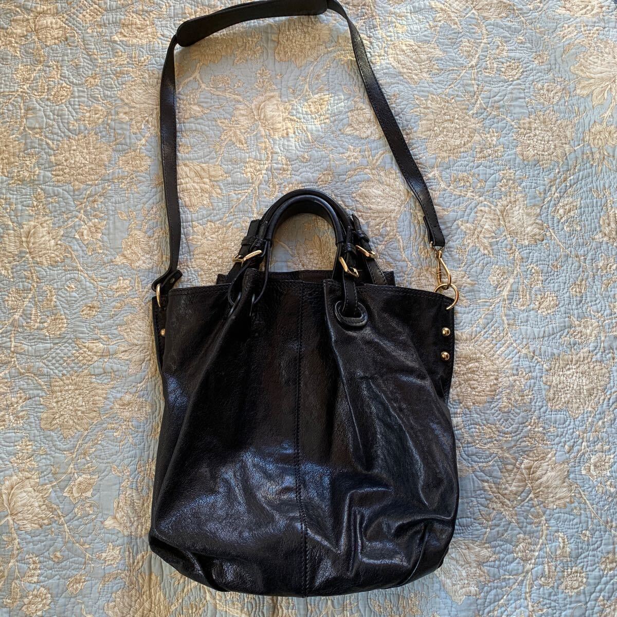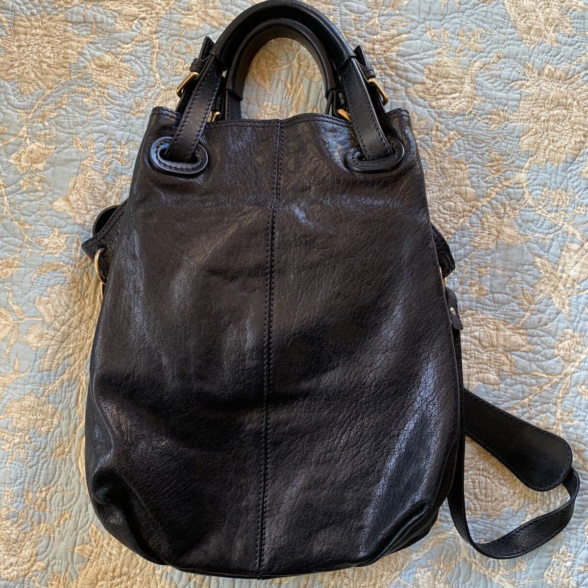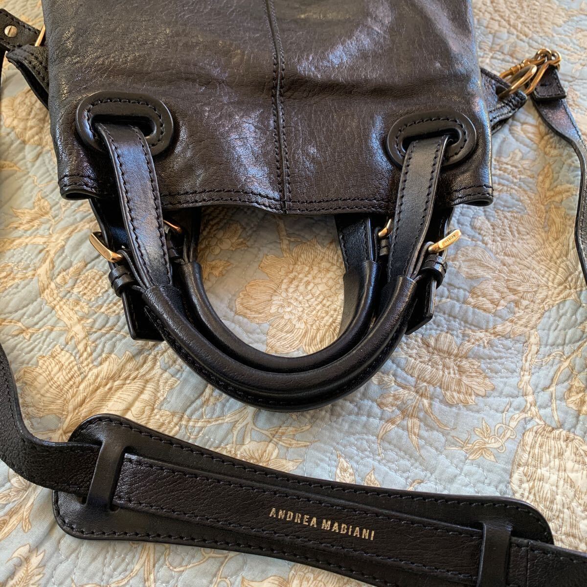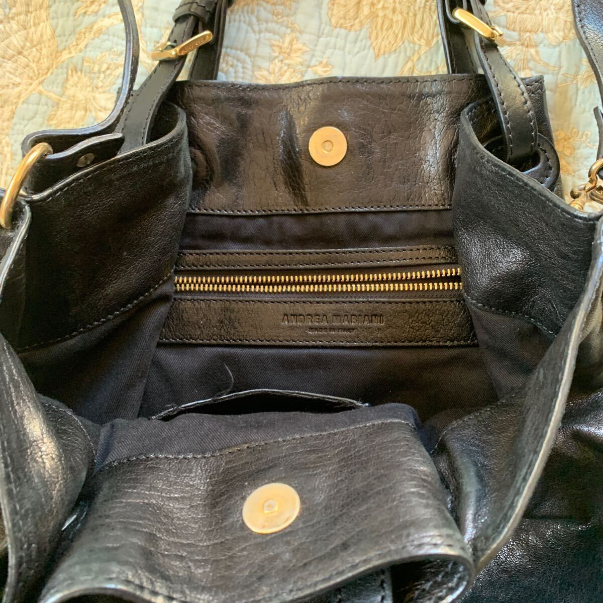 ANDREA MABIANI のバッグでございます。ショルダーベルト取り外し可能です。底にタックがあり、持ち手部分も折りたたんでベルトをとうしておりますので、膨らみのあるデザインです。