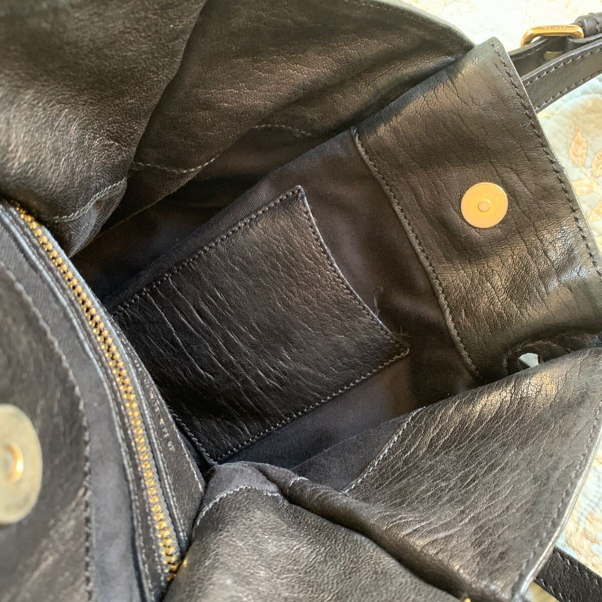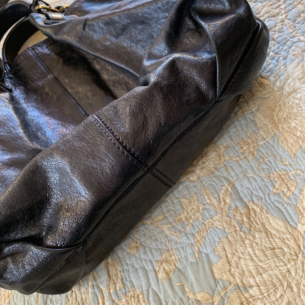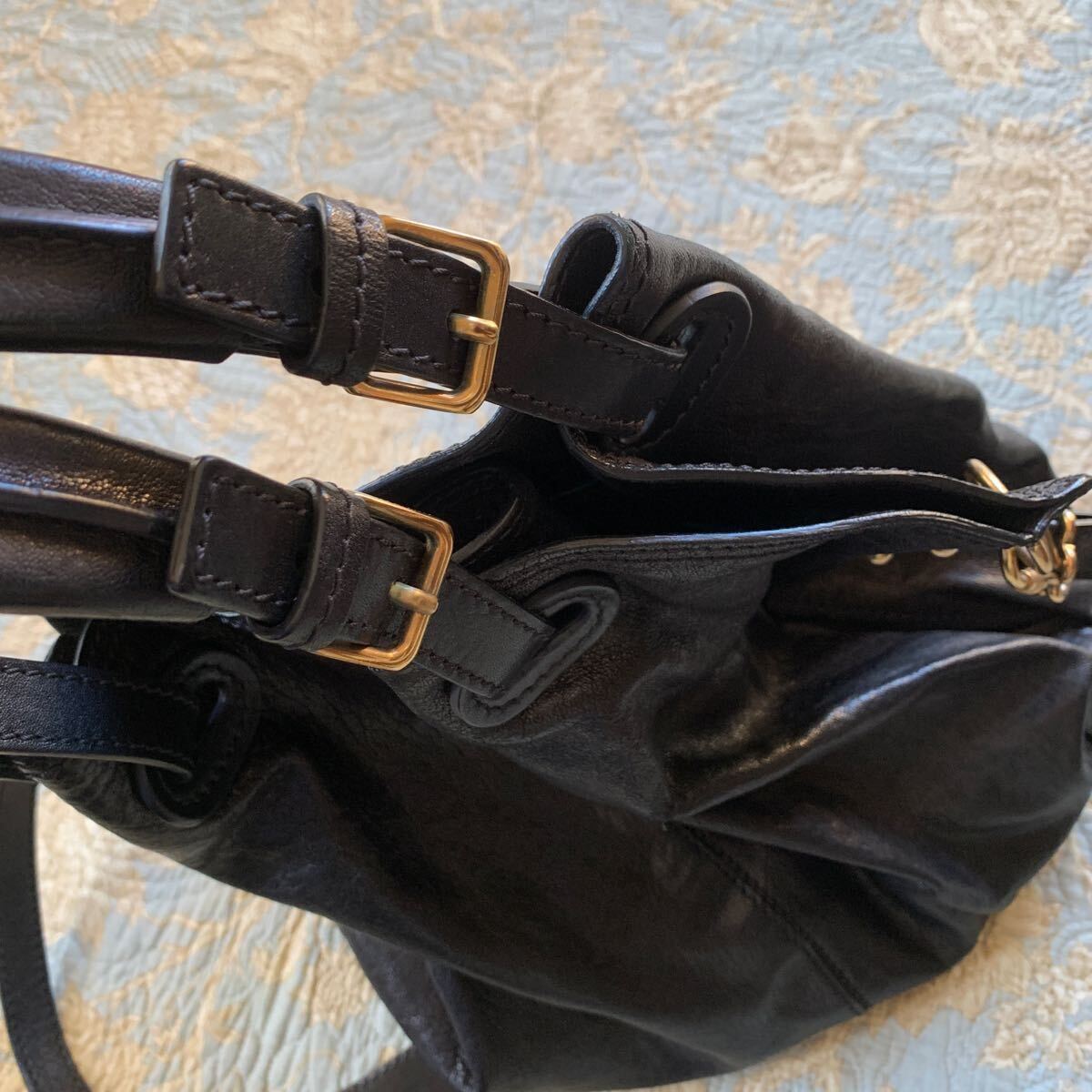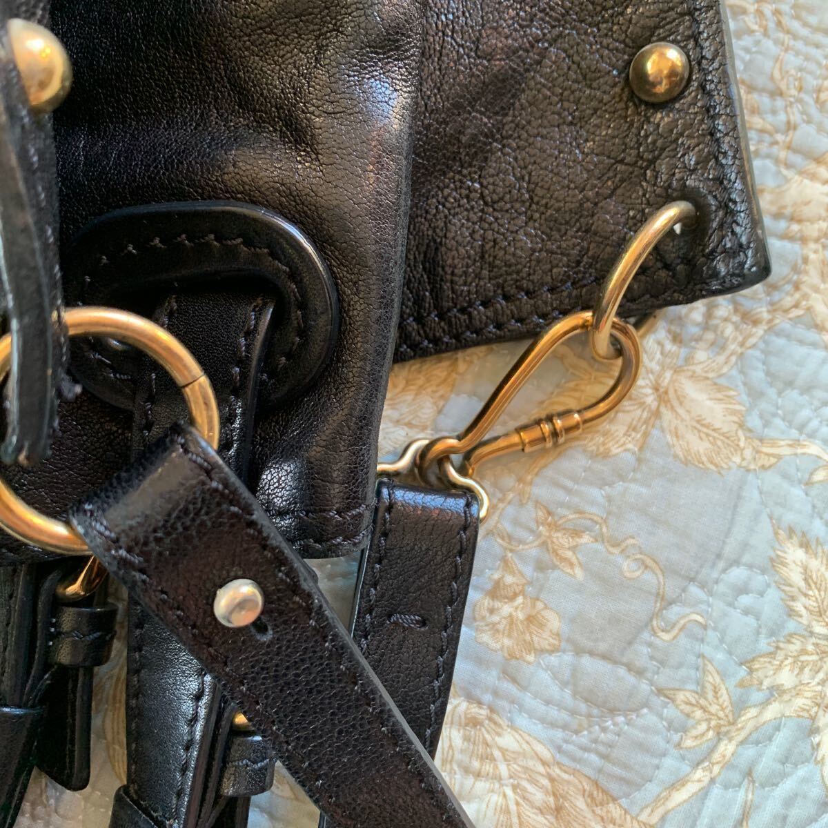 ANDREA MABIANI のバッグでございます。ショルダーベルト取り外し可能です。底にタックがあり、持ち手部分も折りたたんでベルトをとうしておりますので、膨らみのあるデザインです。