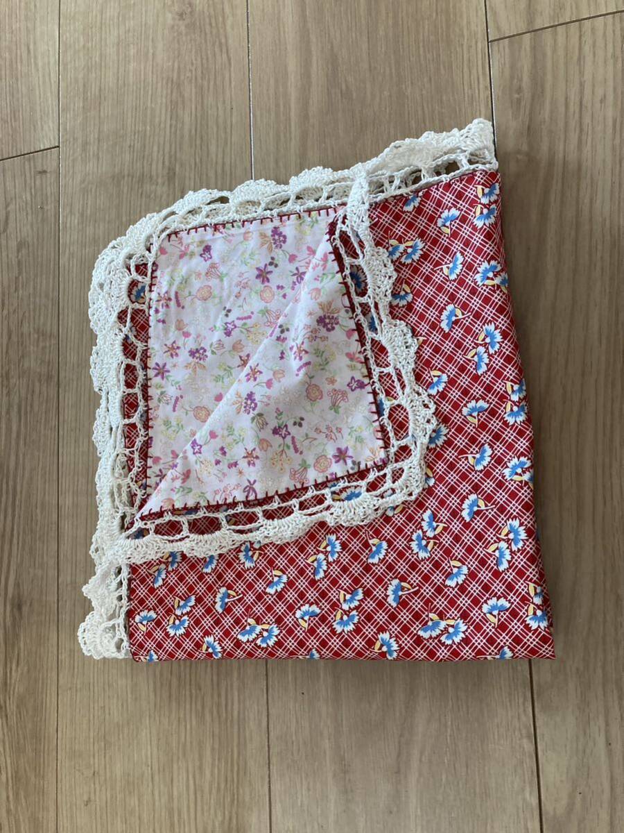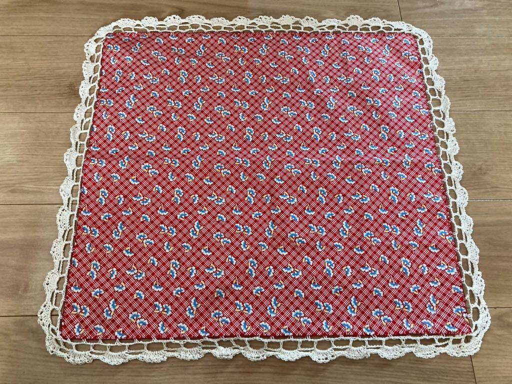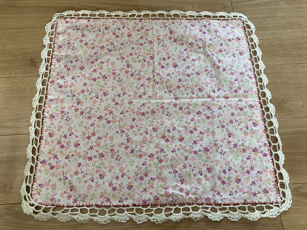 綿の生地2枚ででマルチカバーを作りました。周りにレース糸で縁編みをしました。テーブルクロスやチェストや家電の目隠し&パソコンなど多方面に使用出来るかと思います、インテリアのアクセントにどうですか?大きさが56×60センチです。素人のハンドメイドですので多少の誤差歪みなどご容赦ください