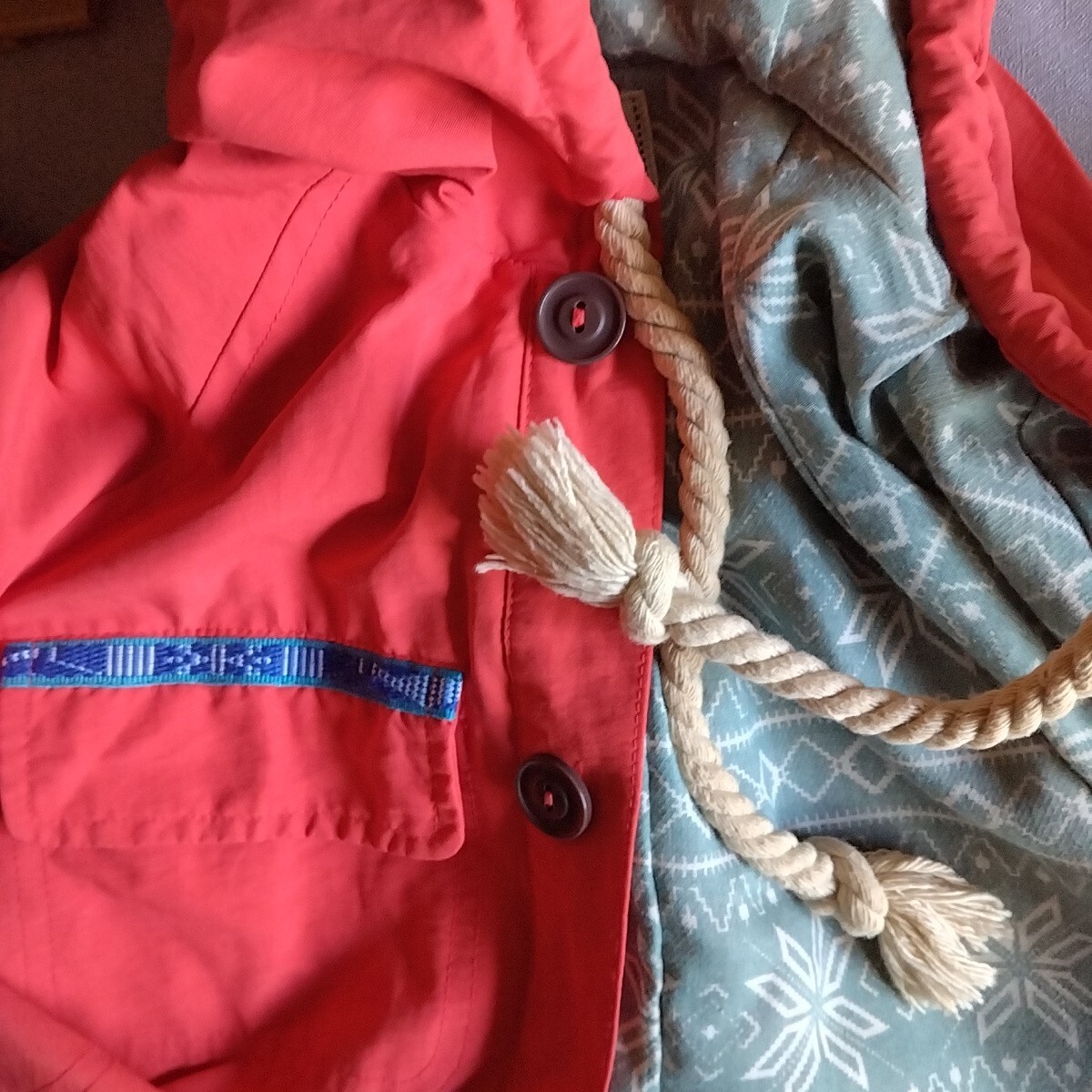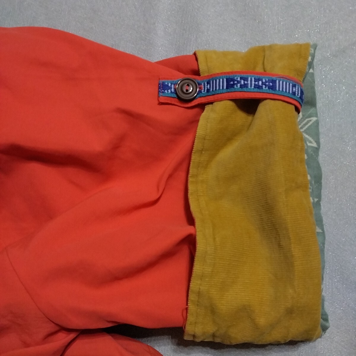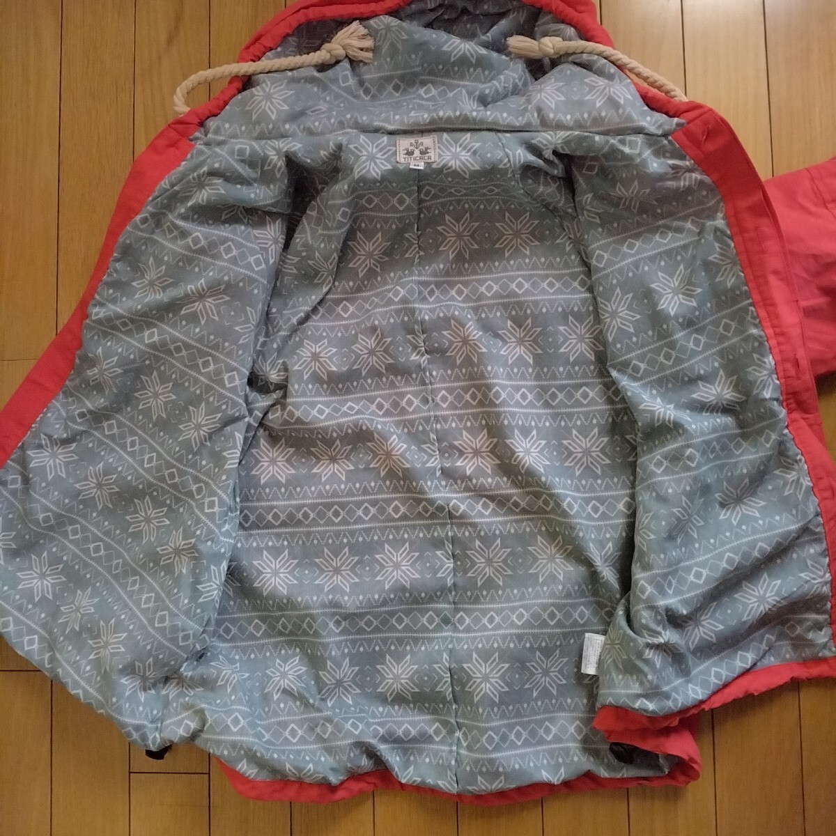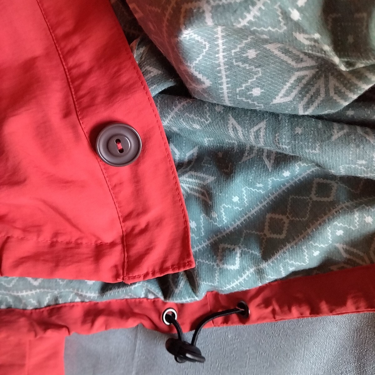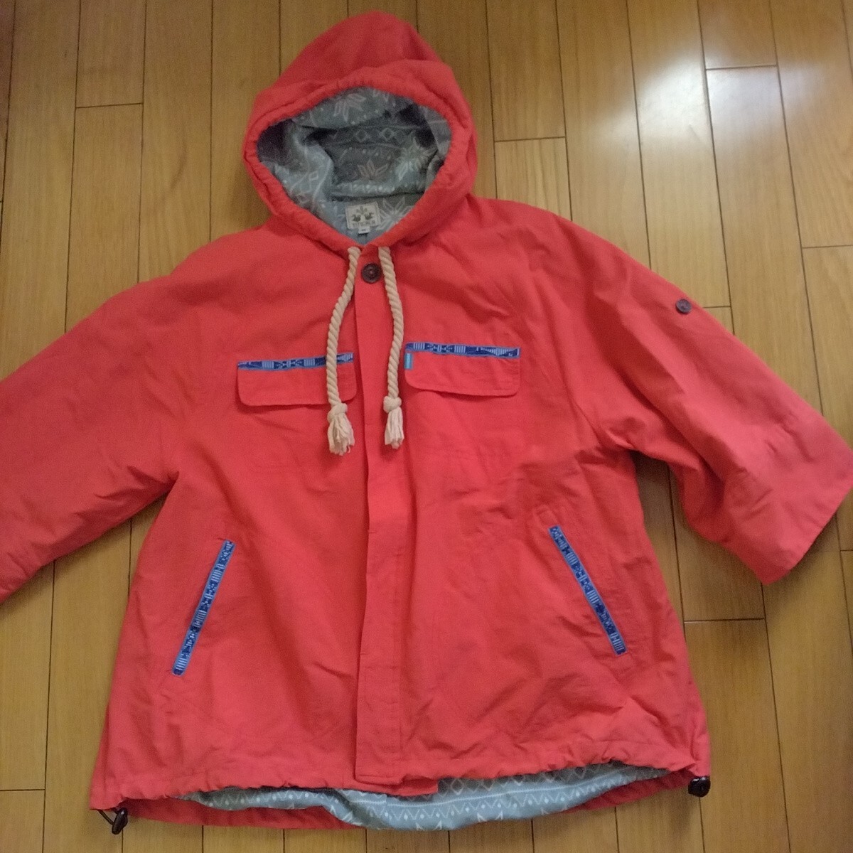 チチカカ ジャケット レディースMサイズ カラーはレッドとオレンジの中間のような色合いです。 薄めの起毛裏地があり、春秋のキャンプなどにおススメ♪ シワがあり多少使用感がありますが、状態は良いほうだと思います。 袖は七分丈で、折り返して半袖にしてもカワイイです♪ 【平置きサイズ】着丈64センチ 身幅50センチ
