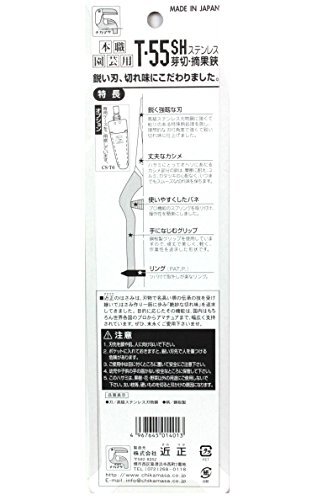 インダストリアル・ T-55SH説明 ●芽切、摘果、摘花、収穫、盆栽に最適です。●【用途】●芽切・摘果・摘花・収穫作業等。●【機能・特徴】●刃の側面を丸めているので、収穫物を傷つけません。●芽切、摘果、摘花、収穫、盆栽、革・ゴム、アルミ缶、銅線などに使用できます。●さびにくいステンレス刃です。●【仕様】●全長:185mm。●重量:105g。●【材質】●刃:高級炭素刃物工具鋼・ハードクロームメッキ。●柄:鋼板製・プラスチックコーティング。●【商品サイズ】幅50×高さ200×奥行18mm 重量140g●商品コード:4967645014013●JANコード:4967645014013●ブランド名:チカマサ●商品名:ステンレス芽切鋏●規格:T-55SH●【注意事項ほか】●刃先を人に向けないでください。ポケットに入れておきますと、鋭い刃先で人を傷つける危険があります。●幼児や子供の手の届かないところに保管してください。使用目的以外の用途に使用しないでください。●ご使用中は目に付くところに置いて安全にご注意下さい。この鋏は園芸以外の用途にご使用しないで下さい。太い枝等、硬い物を切ると刃かけの...