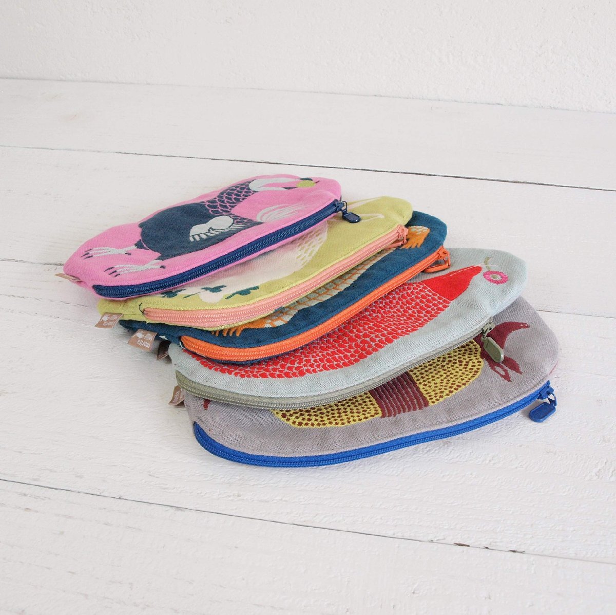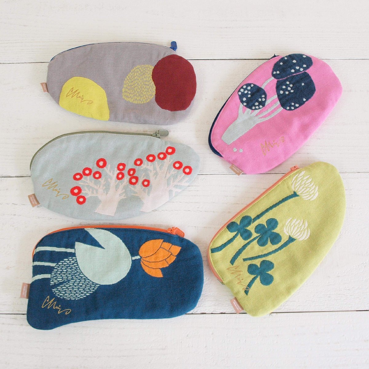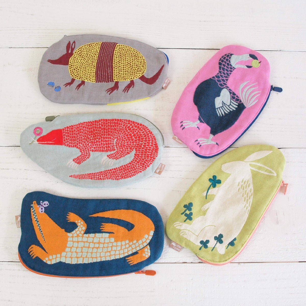 ゆっくりとした世界に暮らす生き物たちのカワイイ形のポーチです。ちょっと不思議であたたかな絵とカラーリングが、絶妙なバランスです。一つ一つの柄にストーリーがあり、その世界観も楽しめます。表柄、裏生地とファスナーのMiWカラー・ハーモニーが新鮮です。
