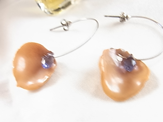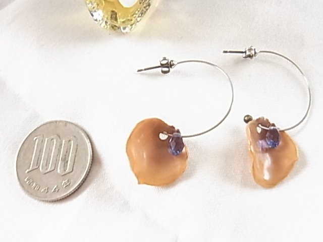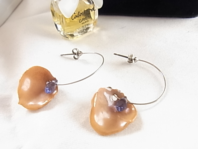 アメジストカラーのビーズ付き くるみいろ 胡桃色 トパーズブラウン系の装飾の半円フープ調 個性的デザイン お洒落なピアス▽