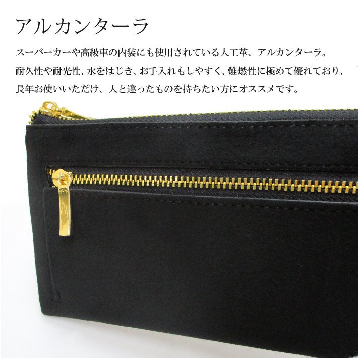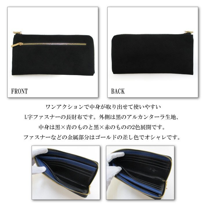 ワンアクションで中身が取り出せて使いやすいL字ファスナーの長財布です。 内部の真ん中のポケットには小銭を入れられ、両サイドにはカードポケットとフリーポケット、お札を入れるスペースがあります。 カードポケットは全部で24か所もあり、薄型でスリムなのにたっぷり収納できます。 表側の素材は、スーパーカーや高級車の内装にも使用されているアルカンターラという、クルマ好きには高級内装素材として知られている人工革です。 スエードに似た高級感ある見た目ですが、より耐久性や耐光性、水もはじきやすく、難燃性が極めて優れていると同時に肌触りの良い素材です。 液体の吸収力が低く、水に濡れても乾けば元通りの風合いを取り戻します。汚れ落としが簡単です。 耐久性に優れているので長年お使いいただけます。人と違ったものを持ちたい方にオススメです。 誕生日プレゼント・クリスマス・バレンタイン・父の日・母の日などの贈り物にも最適です。 外側は黒のアルカンターラ生地、中身は黒×青のものと黒×赤のものの2色展開です。 ファスナーなどの金属部分はゴールドの差し色でオシャレです。 ■カラー:BK/BL ■素材:外側 アルカンターラ、内側 牛革 ■サイズ(約):横21.5cm×縦10.5cm×マチ2cm ■重量:約180g ■仕様:ファスナー開閉、小銭ポケット×1、札入れ×2、フリーポケット×2、カード入れ×24、ファスナーポケット(外側)×1 ※一部共通画像使用 ※ご注意※革は自然が造り出した理想的な繊維です。 自然由来の素材のため革には細かなシワや傷跡・トラ等が存在する場合があります。 これらは本革である証拠であり、革本来の特長であり、魅力でもあります。 ※新品ではございますが製造上の過程により商品によっては細かな傷やへこみ、剥げ等がある場合が御座います。 また、多少の縫製のゆがみ・ノリの付着がある場合がございます。 ※ご覧のモニターやプラウザの設定、照明等により、画像と実物の色合いが、若干異なる場合が御座います。 予めご理解頂いた上でご購入下さい。 | |