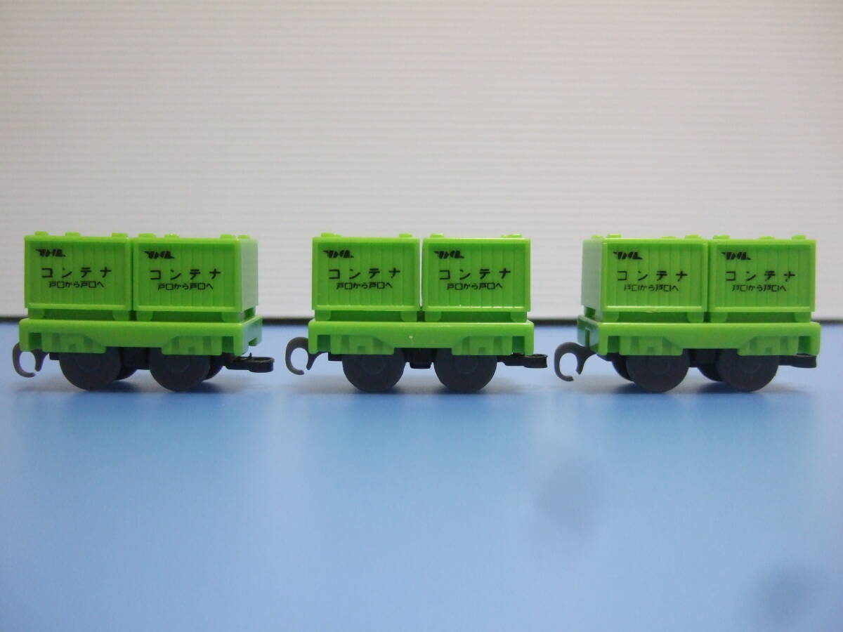 カプセルプラレール 「がんばれ!はたらく列車編」のコンテナ車C(黄緑 JNR) 3両 中古品です。