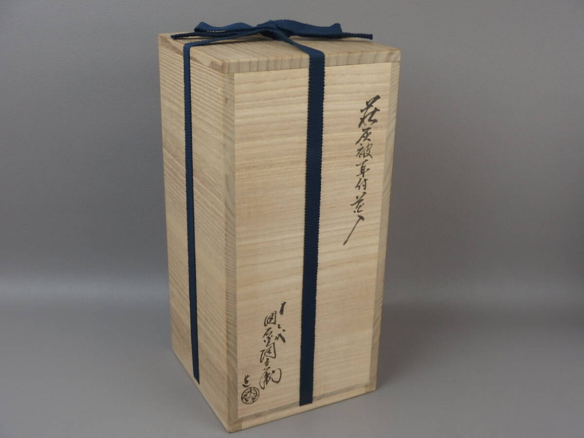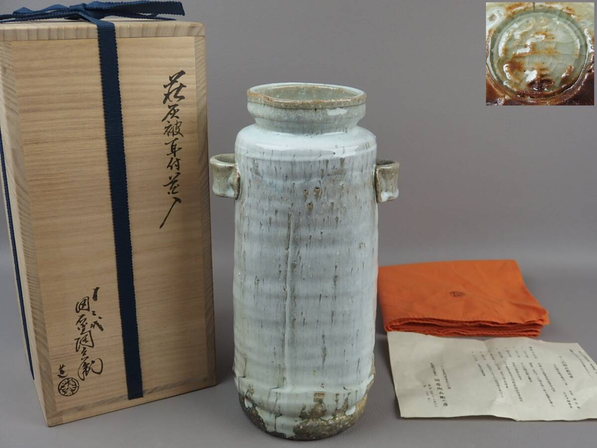 萩焼、十二代、田原陶兵衛、萩灰被耳付花入、共箱です。