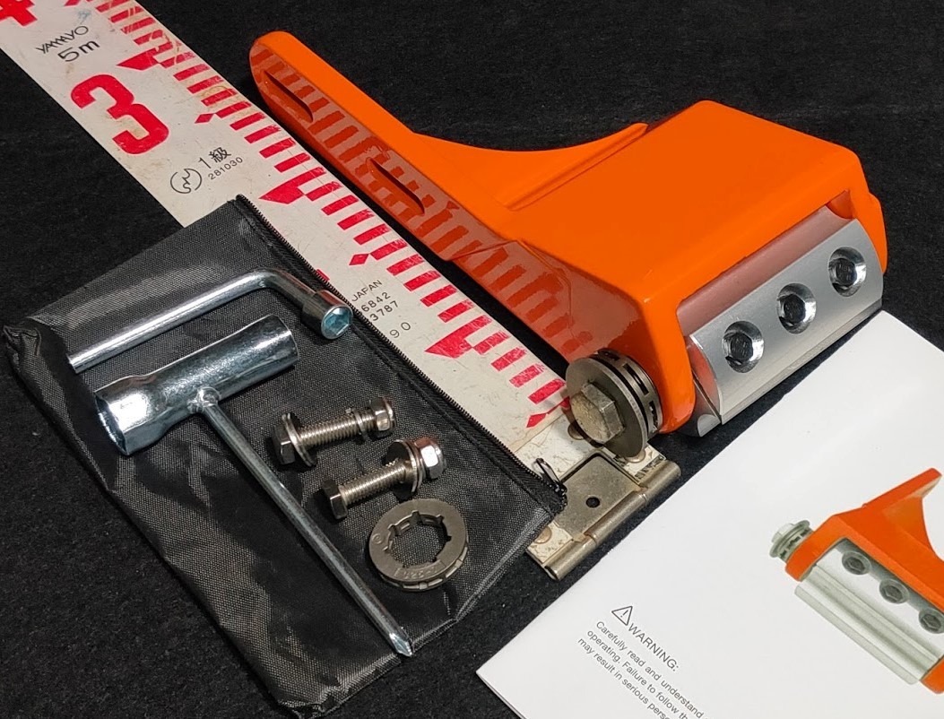 ログハウスビルダーはもちろん、より木目を生かしたいとき、掘削したいとき、カービングやチェーンソーアートで仕上げたい、樹皮削りに!! 3/8ピッチ と 325ピッチ に対応したリムスプロケットが付属します。 現在使用中のチェンソーに取り付ける場合、一回り長いソーチェーンを使用します。 例えば16インチ用のソーチェーンである場合、18インチ用のソーチェーンを使用します。 純粋に木質だけを削っているのであれば刃の鋭利さは長持ちしますが、土や砂、石、泥、氷などに当たってしまうと鈍らになりますのでご注意ください。 替え刃は、アマゾンやホームセンターでも入手できる電動カンナの替え刃が適合します。サイズにご注意ください。 英文説明書 | |