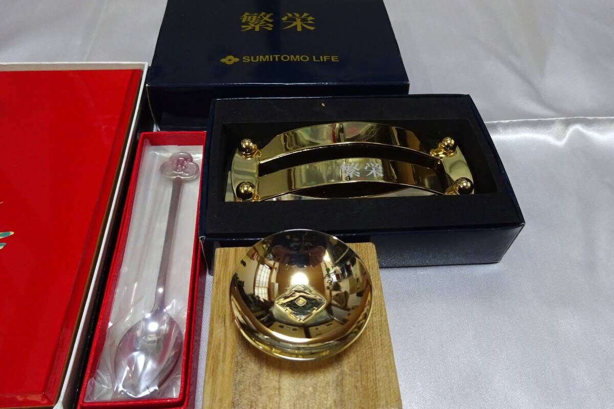 住友生命 販促品グッズセットです。 クリアファイル16枚、金杯(24Kメッキ)、ペーパーウェイト 、住所録、コーヒーカップセットスプーン等です。