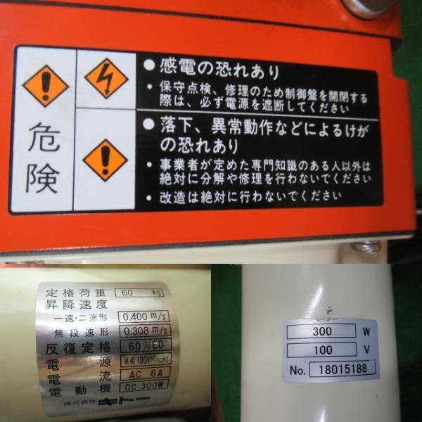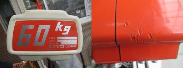 【メーカー】KITO キトー 【型式】EDH06S 【仕様】 ・電源コード:5m(3Pプラグ付) ・操作電圧:100V ・2点押ボタン式 ・1速形 ・定格荷重(t):0.06 ・標準揚程(m):15 ・巻上速度(m/min):24.0 ・フック間最小距離(mm):315 ・時間定格(min):50 ・電源(V):単相100V ・電源コード長さ(m):5m(3Pプラグ付) ・電源:単相100V ・モータ出力(kW):0.3 ・質量:19kg 〔材質〕 ・ロードチェーン:ニッケルメッキチェーン 〔特長〕 ・パワーとスピードを備えた小容量タイプです。 ・メカニカルブレーキ付です。 ・上限リミットスイッチ・過巻防止装置付です。 ・強力ロードチェーン使用しています(特殊防錆処理の合金鋼焼き入れチェーン)。 中古品になります。 ※初期不良の場合商品到着後7日間は返品対応致します。 ※実作業による長時間の確認は行っておりません。 ※上下の動作確認を行っております。 中古品ですの外箱に破れ・汚れ・歪み等がございますのでご了承願います。 画像の物が全てになります。 他に付属品等はございません。 上記の事をご理解・ご了承の上で ご入札をお願い致します。 その他ご不明な点等ございましたら、ご入札前にお気軽にご質問下さい。 ※17時以降にお問い合わせ頂いたご質問等につきましては、お応えするのが翌営業時間中になりますのでご了承ください。 ※オークション終了日当日のご質問は、17時迄にお願い致します。 *詳細につきまして ご質問されましても お答えできない場合もございます。 |