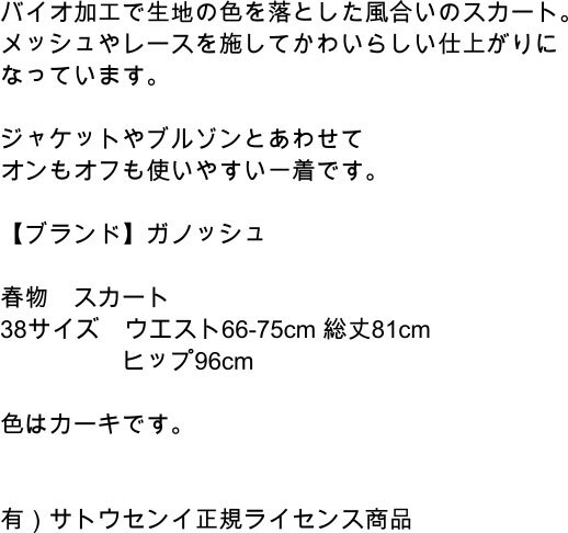 | 商品名 | スカート 38サイズ ガノッシュ 247-71040 SS 30代 40代 50代 レディース カジュアル 春 夏 1点物 通勤 新品 あす楽 ganosch |