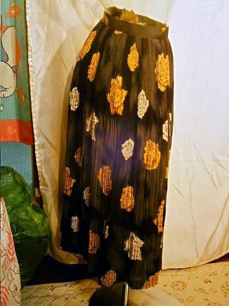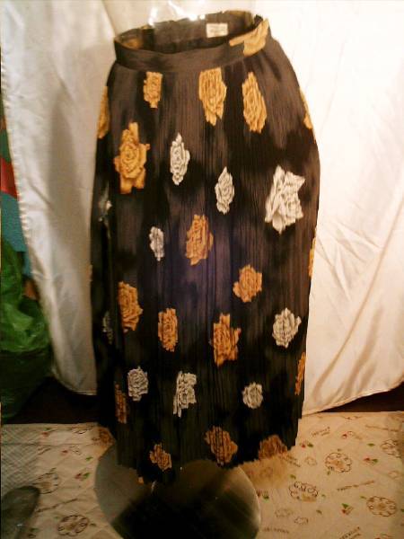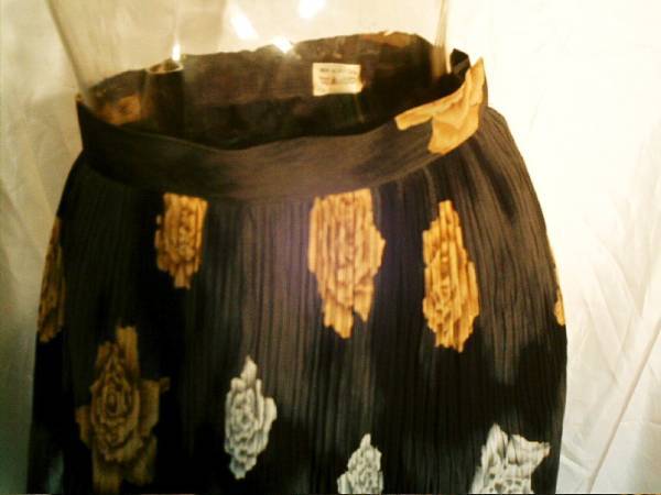 裏地付きでウエスト部分サイドファスナーカギホック付きでバラ柄のサラッとした生地で素敵な細かなプリーツ風ロングスカートです。着用はありませんが自宅保管があります。