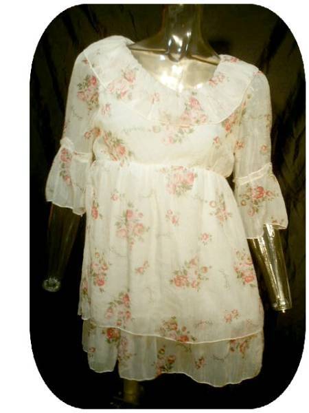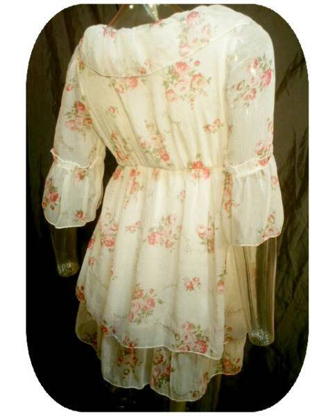 シフォン系でとても甘カワな乙女チックなお花ローズ柄のふんわりチュニックになります。お襟ネックからフリルで胸下ゆるシャーリング入りで絞まった感じで裾2段フリルでAラインでとても可愛いです。お袖7部位で切り替えフリル付きで幅広がっていてシースルーでキレイです。身頃は裏地ホワイト付きで透け感はないです。1回着用の美品です。お色:ホワイト・ローズピンク 生地:ポリエステル100% サイズ:SM 着丈66 身幅37.5