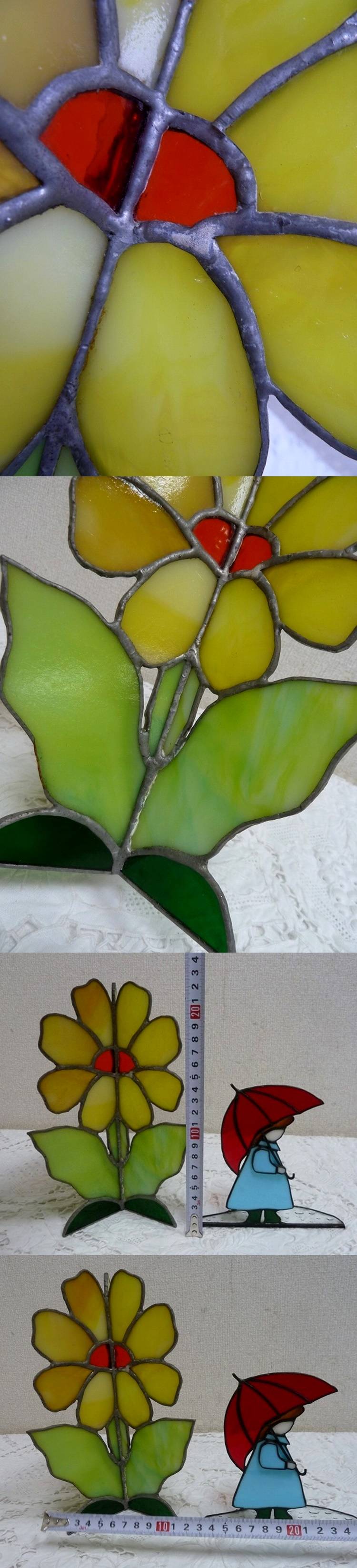 (☆BM)ステンドグラス(0122-28)ガラス製 オブジェ 2点 ひまわり&赤い傘の女の子 置物 花 向日葵 昭和レトロ アンティーク調 カラフル