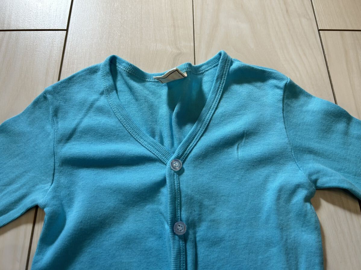 ☆ブランド・・・プラスナオ ☆お色・・・ターコイズブルー ☆サイズ・・・100 平置きの状態で、身幅・・・26.5cm 着丈・・・36cm 袖丈・・・35cm です。 素人寸法ですので参考程度にお考え下さい。 ☆薄手素材のカーディガンです。 ☆ほつれ等の痛みはありませんが、多少の生地の馴染みが見られます。 タグに記名がありますので、塗りつぶした状態でのお渡しとなります。 ご理解の上ご入札下さい。 ☆細かいことをお気にされる方、神経質な方は入札をご遠慮下さい。 ☆自己紹介も必ずお読み下さい。