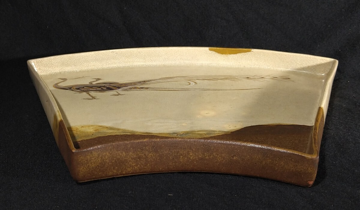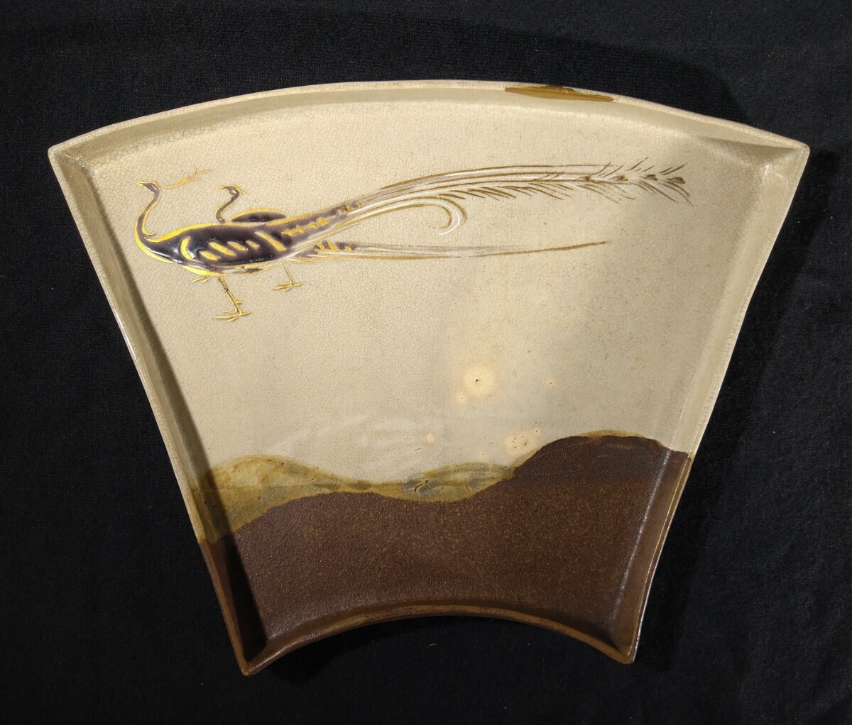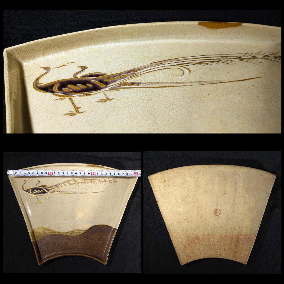 繊細なタッチで優雅に歩む双孔雀が描かれた、須田菁華先生の落ち着いた佇まいの扇形大皿でございます。口縁部に金継ぎがございます。素人採寸で申し訳ございませんが、幅30.9cm、23.8cm、高さ2.8cmでございます。