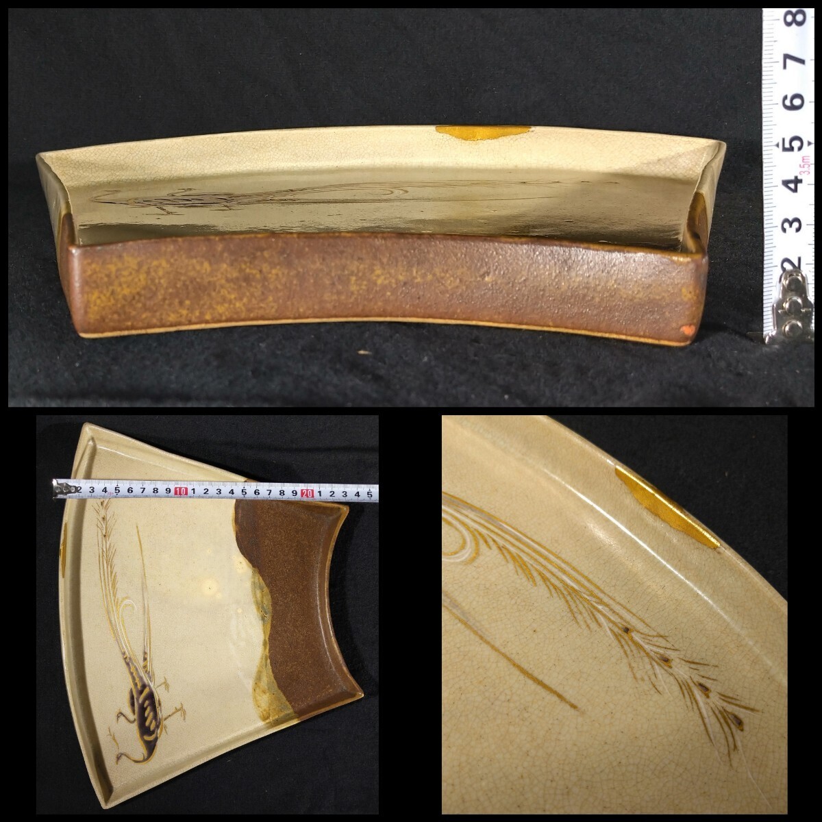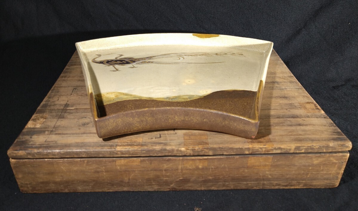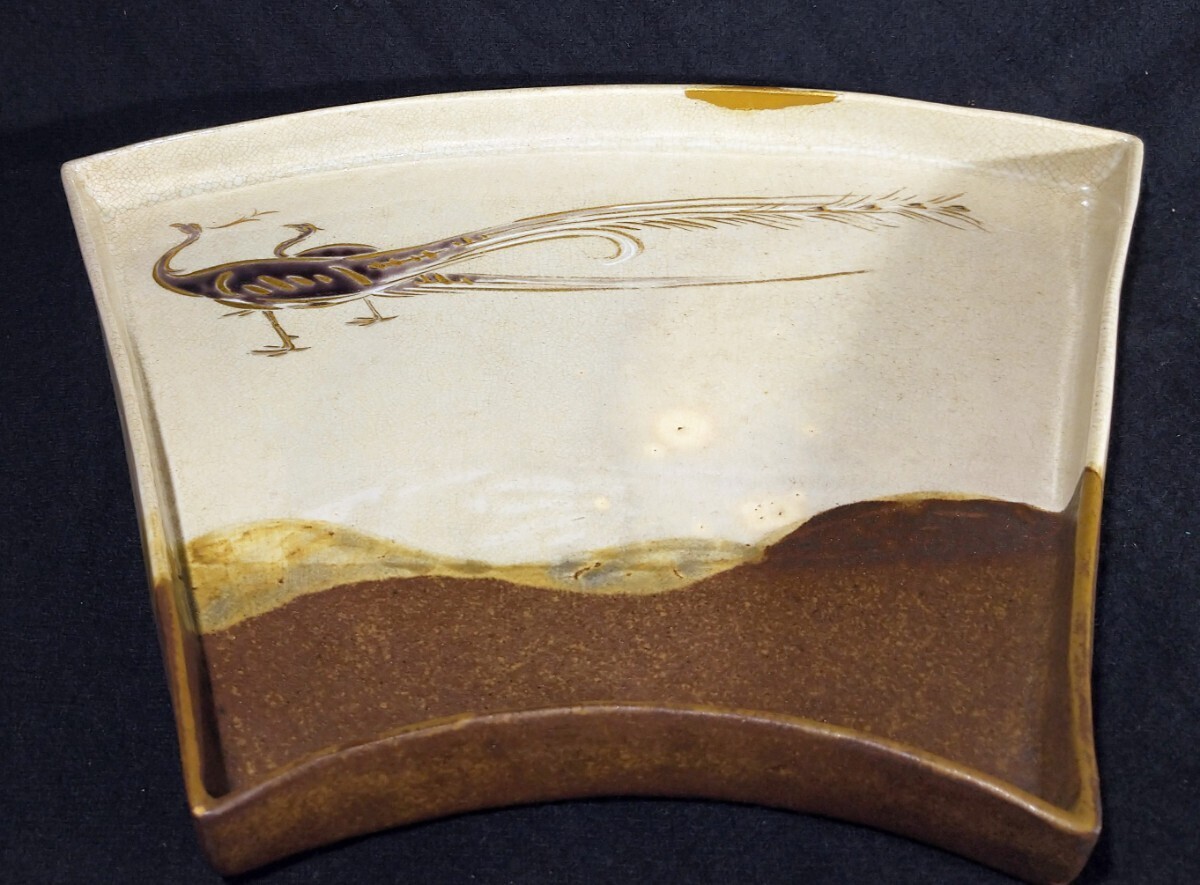 繊細なタッチで優雅に歩む双孔雀が描かれた、須田菁華先生の落ち着いた佇まいの扇形大皿でございます。口縁部に金継ぎがございます。素人採寸で申し訳ございませんが、幅30.9cm、23.8cm、高さ2.8cmでございます。