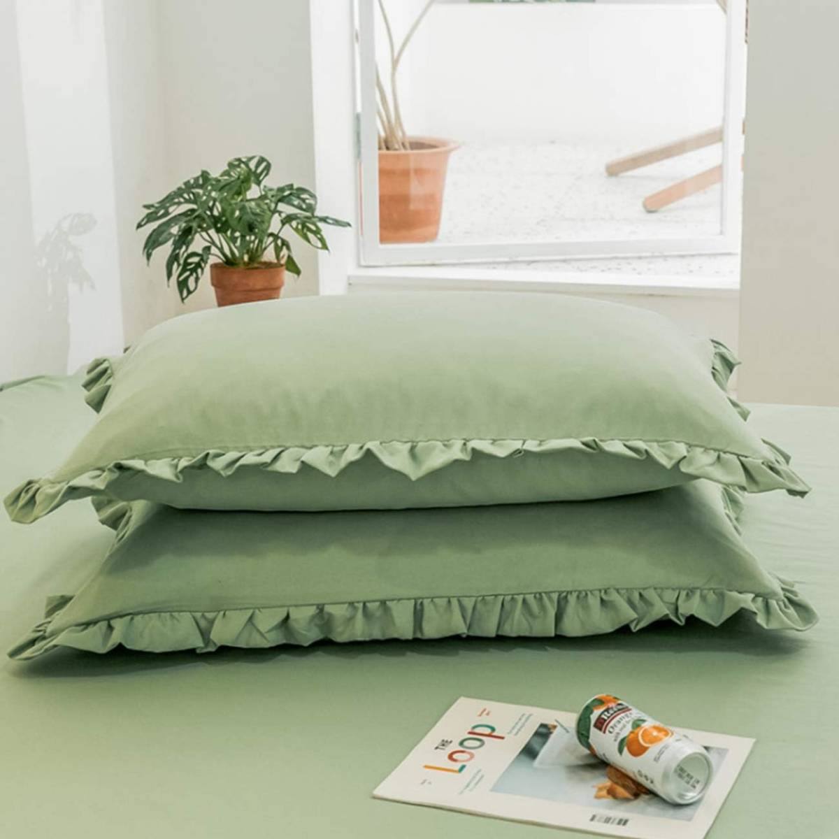 【新品・未使用】フリル付き枕カバー(ライトグリーン)