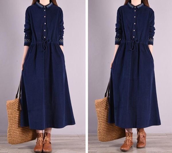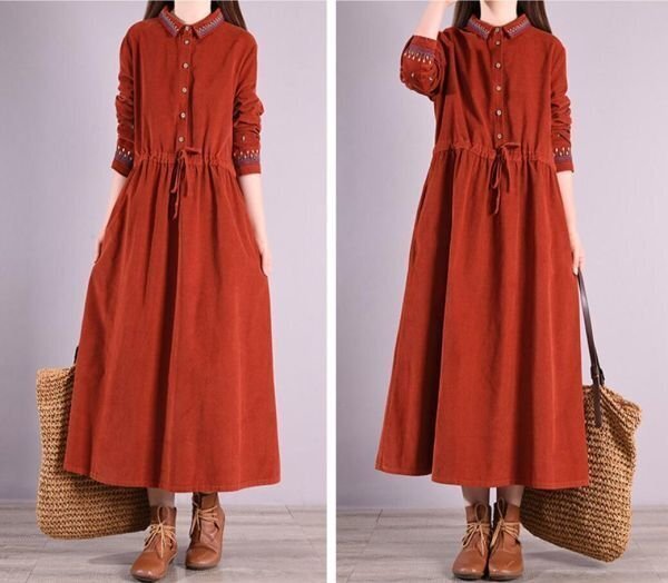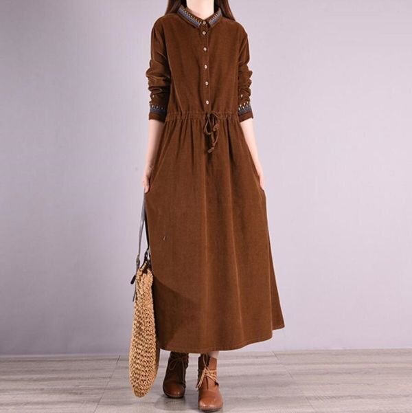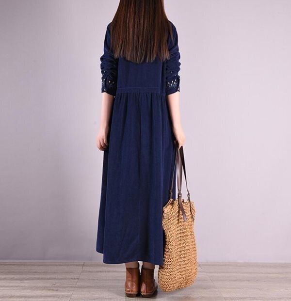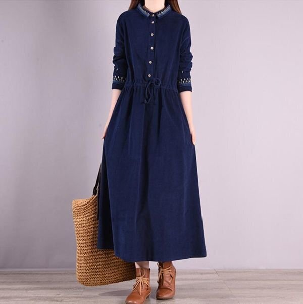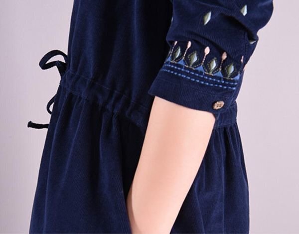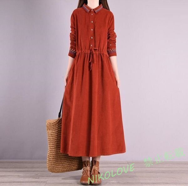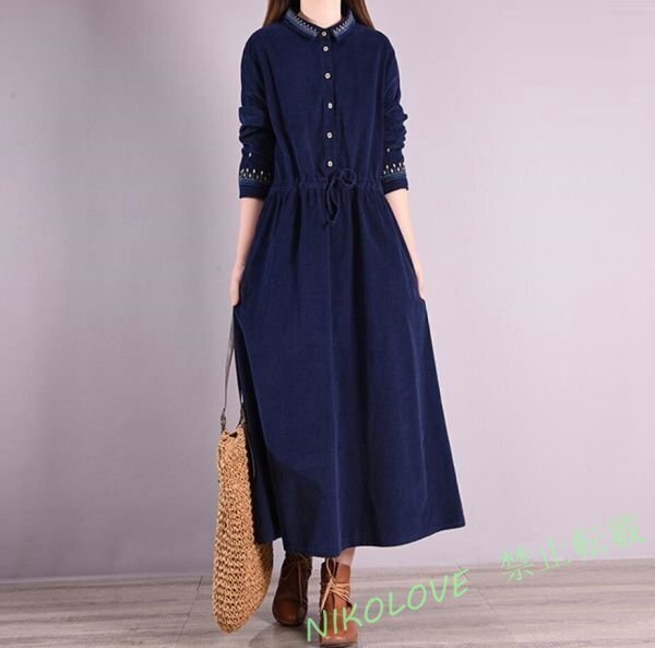 LC106 カジュアル マキシワンピース 刺繍入り 長袖 ゆったり コーデュロイ 着やせ ロング丈ワンピース 大きいサイズ 緑/Lサイズ