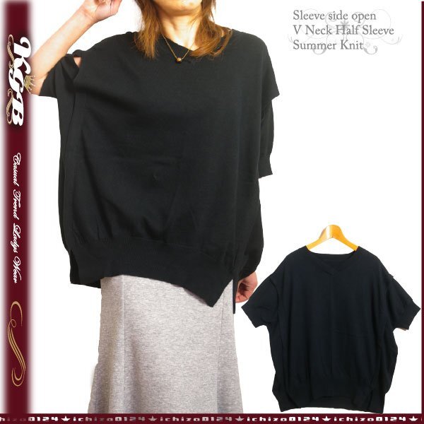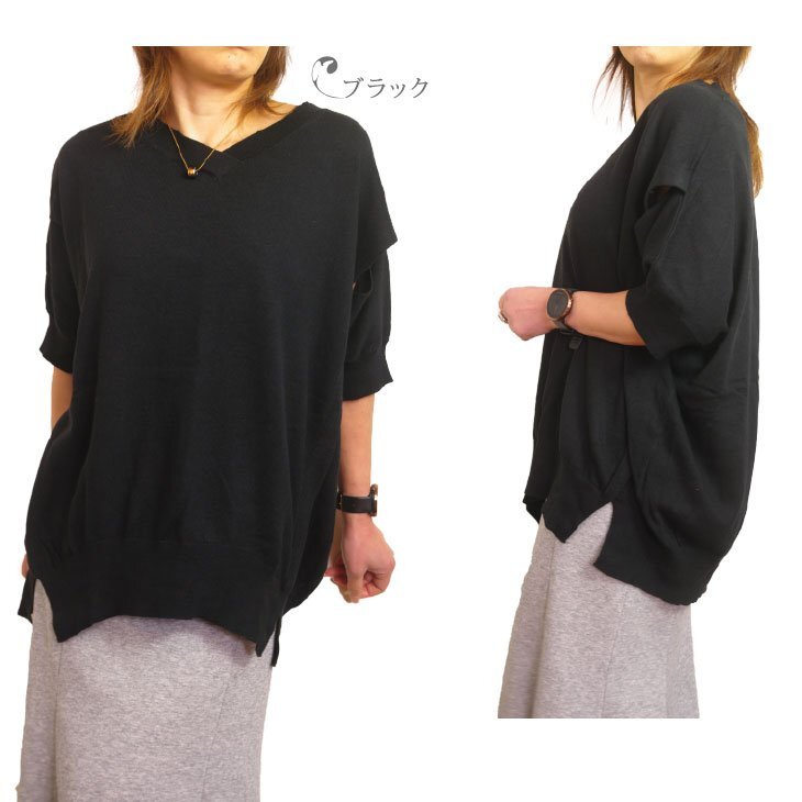M~L カットソー 5分袖 レディース サマーニット 袖脇オープン Vネック ゆったり ブラック 新品