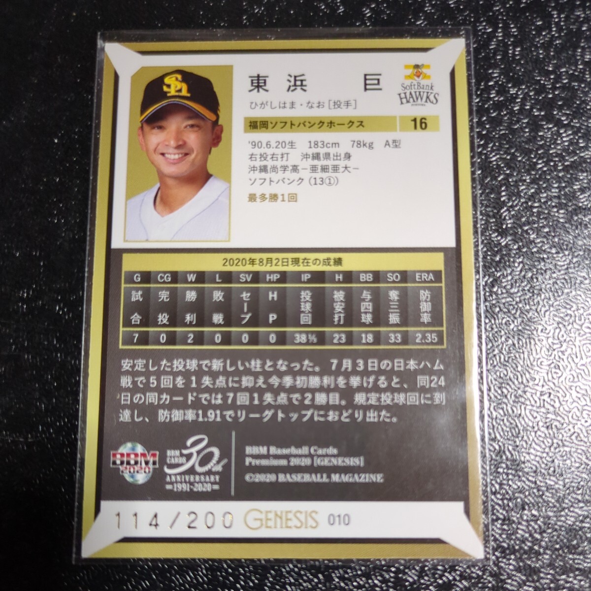 BBM 2020 東浜巨 福岡ソフトバンクホークス ジェネシス genesis プロ野球 レギュラーパラレル 010 200枚限定