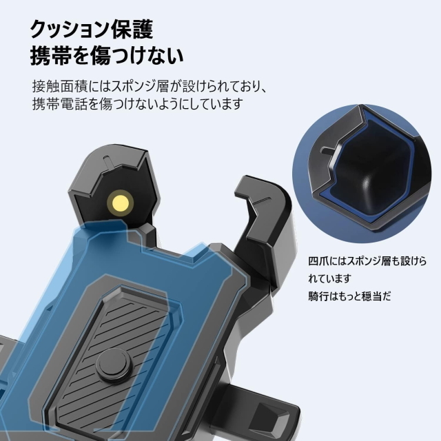 スマホが直接当たる四隅にはゴムパッドが付いており、衝撃や振動、操作による落下を防止します。