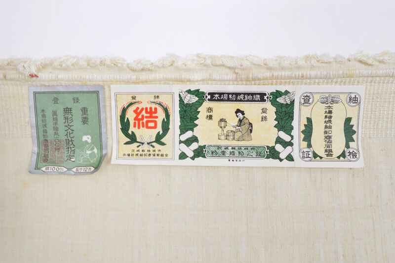 2Fきもの 重要無形文化財 結城紬 証ラベルあり 桐箱入り 反物 巾37cm 着尺 生成り 薄い黄点2カ所 手織り いざり機 手績 送料無料 (02-00-1)