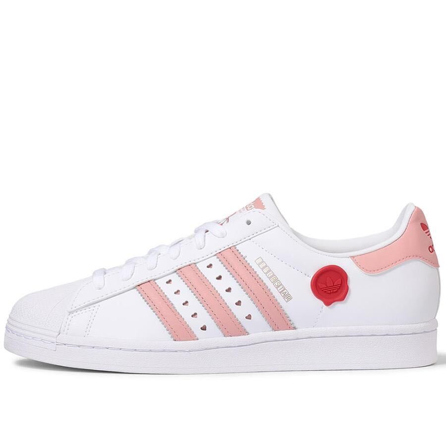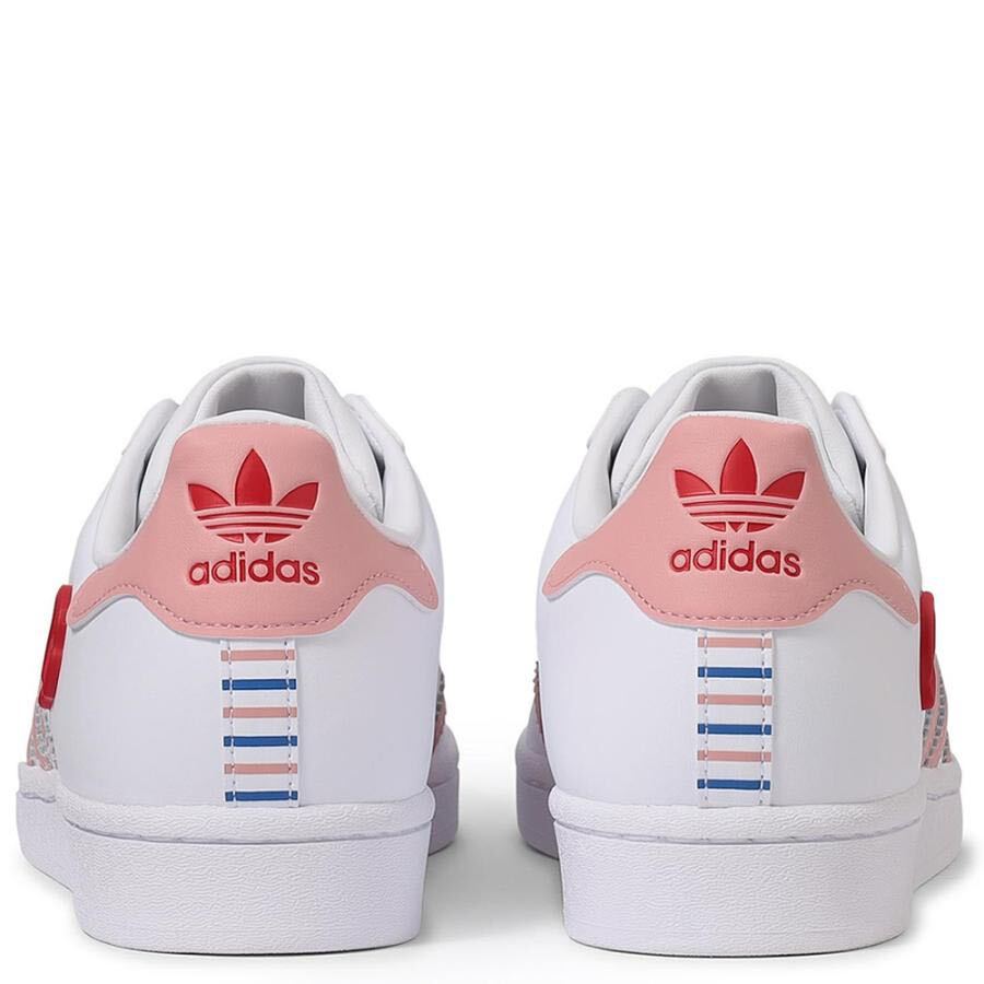 つま先部分のラバーパーツ(シェルトゥ)とギザギザのスリーストライプス、シュータンにはスーパースターボックスロゴをあしらったアイコニックなモデル。