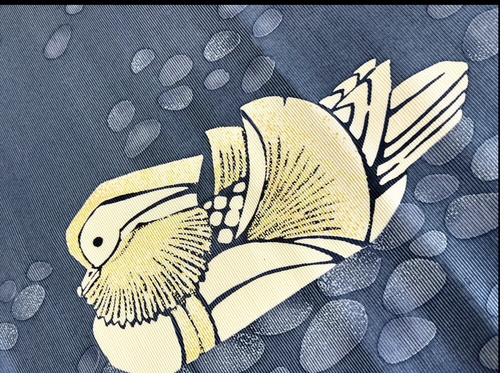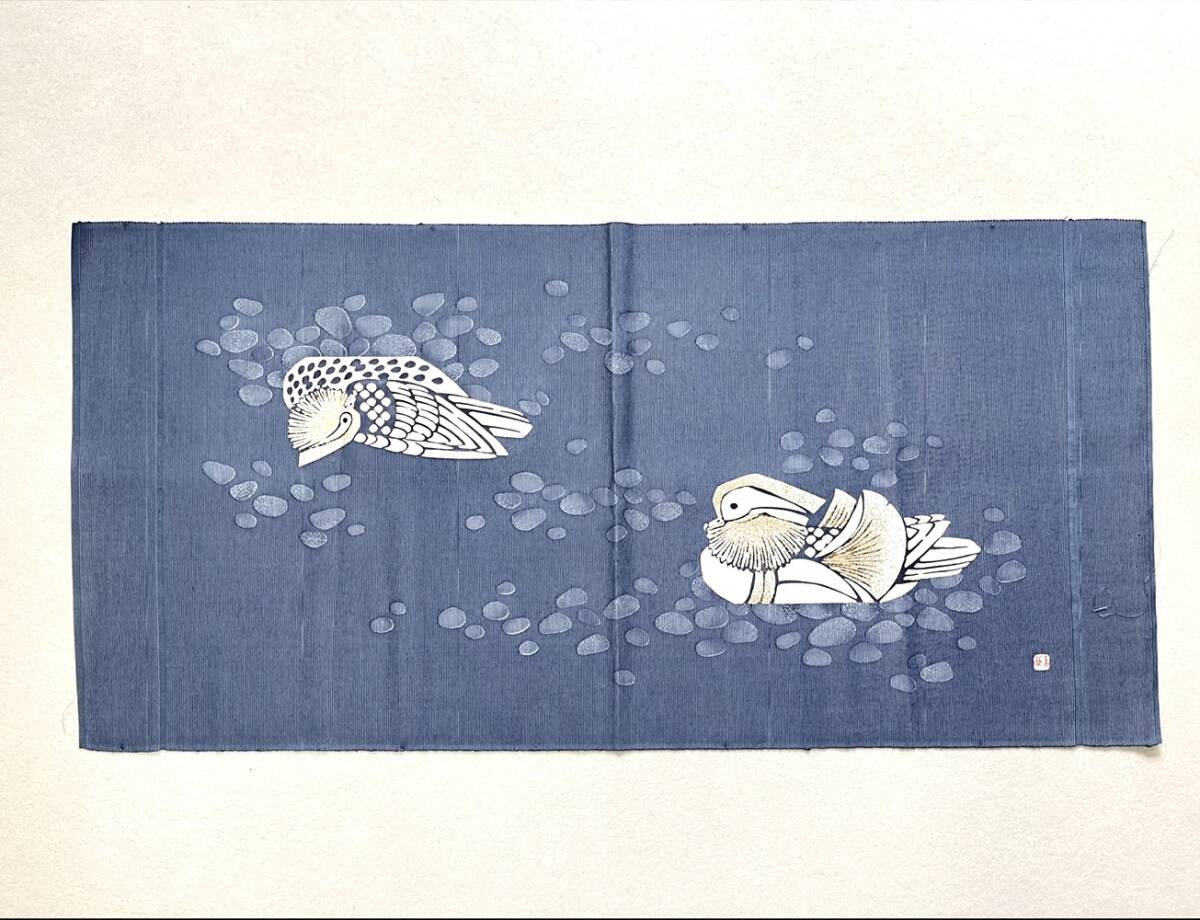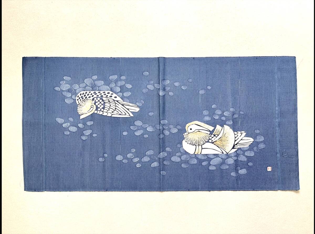 羽田登喜男の鴛鴦が染められた布です。