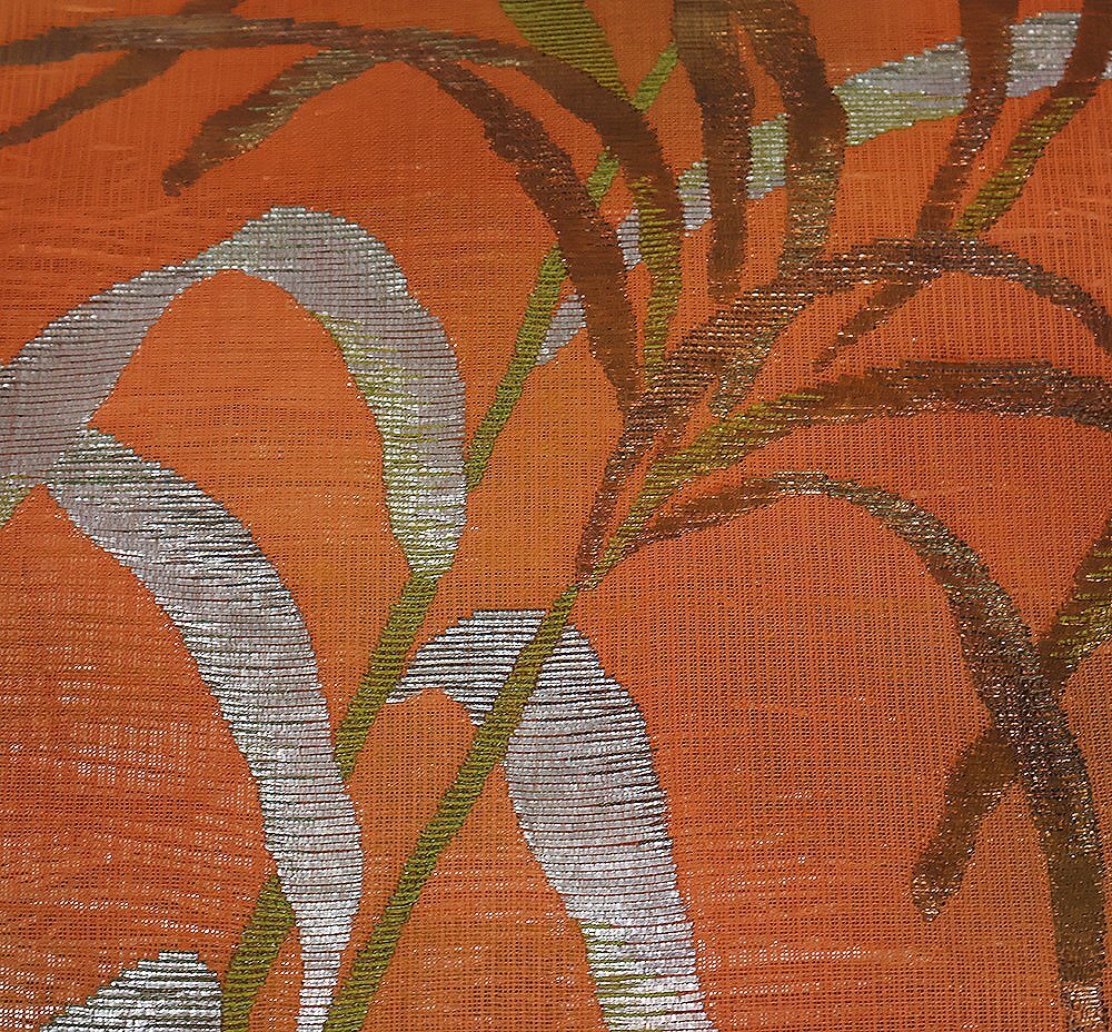 | 紗 櫛織 西陣織袋帯 橙色・緑暈し地 金・銀・草柄 仕立て上がり | |