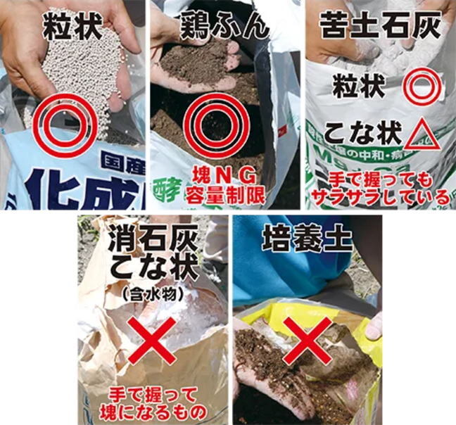 | 3.石灰、鶏糞等の土壌改良剤・肥料は比重が重いので、底面に固まり、排出(散布)されない 場合があります。 |
