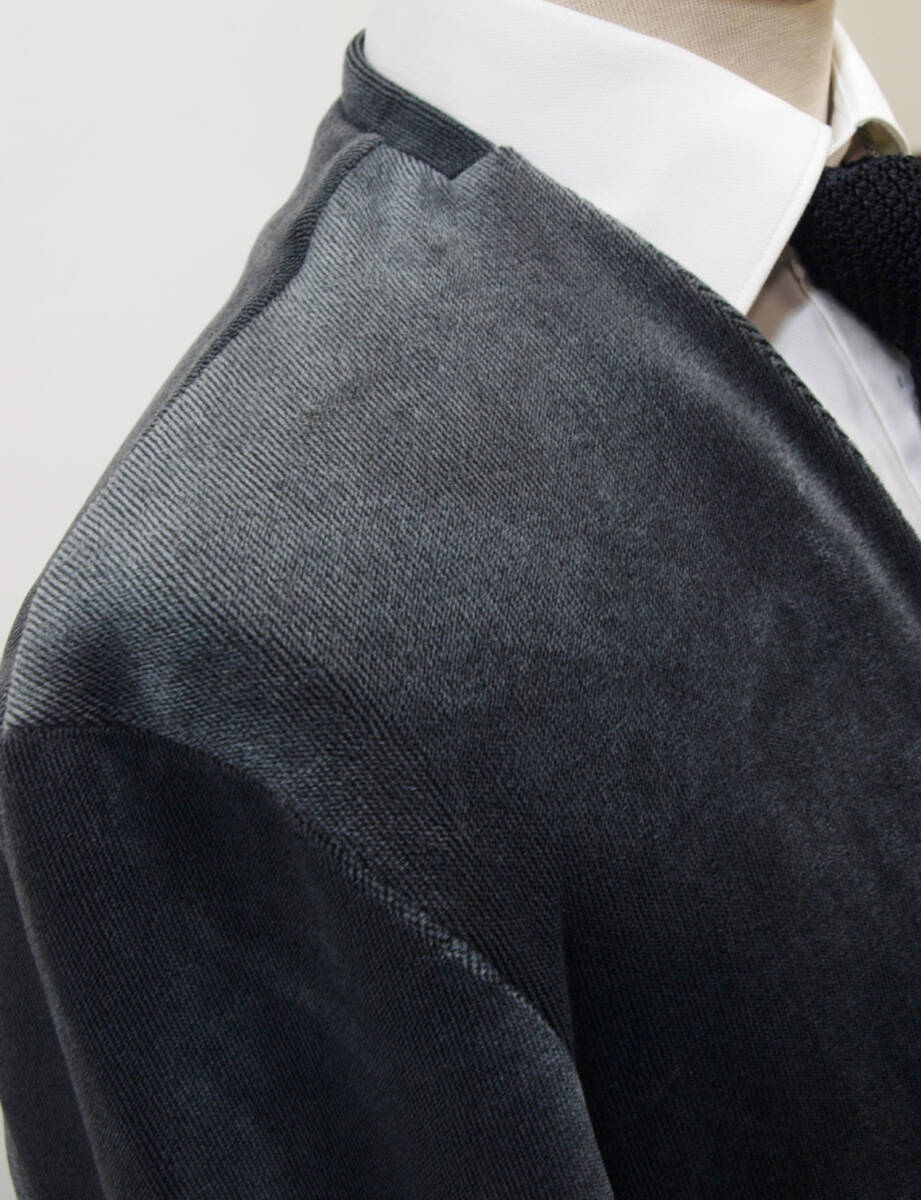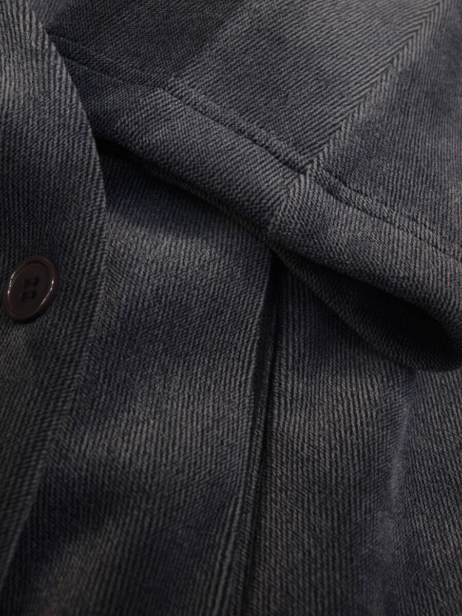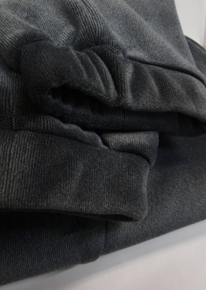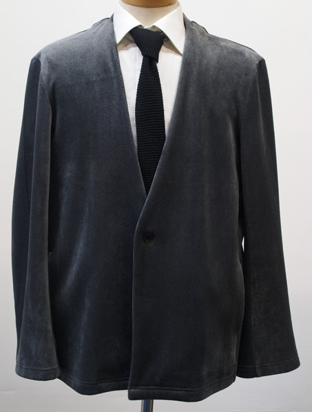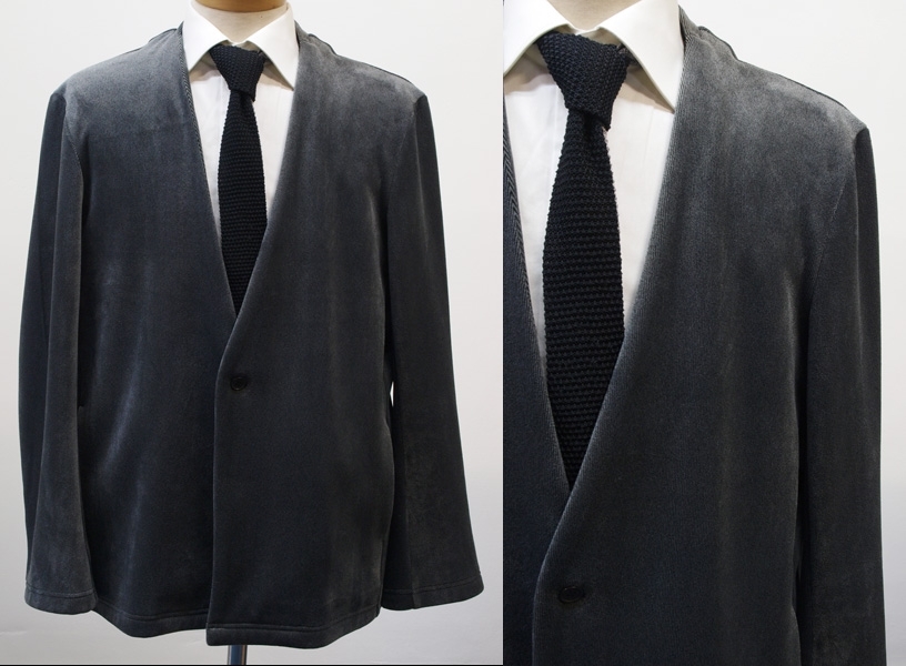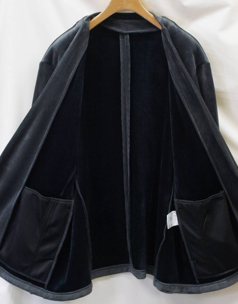 【サイズ】 L (AB6~AB7号サイズ相当) 目安の体型 身長170cm~180cm、ウエストサイズ90cm~106cm 【ジャケット実寸】 肩幅52cm 着丈71.5cm 袖丈61.5cm 脇下部分58cm 身幅54cm 【パンツ実寸】 ウエスト(胴回り実寸)最小90cm~最大106cm(ウエスト両脇ゴムシャーリング) わたり幅34cm(股下10cmの部位で31cm) 裾幅14.5cm 脇股上24.5cm 前股上27.5cm 股下76cm(裾口平ゴム入り始末/新品) 【素材】 表地:ポリエステル100% 裏地:胴裏/なし 袖裏/なし 真冬向けの厚手の毛布のような肌触りのポリエステル起毛素材を使用 裏面も起毛した毛布のようなポリエステルを使用 【色】 濃いグレー 【柄】 縦織柄 【デザイン】 ゆとりのあるシルエット、ノーカラーVゾーンカーディガンスーツ新品、裾上げしていない状態です。 ・ジャケットはノーカラーでシングル1つボタン、カーディガンスーツ、ゆったりシルエット ・パンツは裾口が平ゴム仕様のジョガーパンツ 秋冬対応商品です。 【縫製仕様】 ・ジャケットはノーカラー、Vゾーン、前身1つボタン、両脇にシームポケットポケット、胸ポケットなし、肩パットなし、筒袖で袖口ボタンなし、ノーベント、内ポケットなし、裏地なし ・パンツはノータック、ベルトループ付き、ウエスト両脇ゴムシャーリング、外側にドローストリング(紐付き)、膝裏当てなし、脇ポケット縦付け、後ろポケット右左ともにアウトポケット、フロントはファスナーでボタン仕様