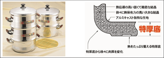 | ■平均3ミリのアルミキャスト(羽釜と同じ鋳物製)ですから、ムラなく熱が伝わります。 |