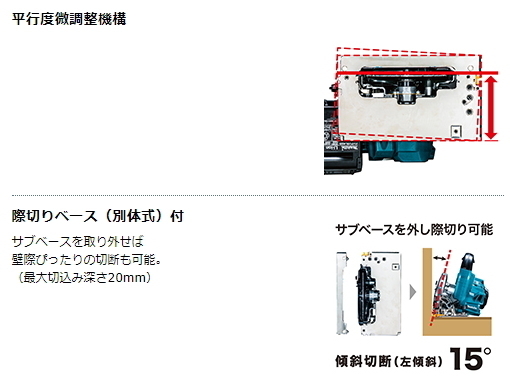 ■際切りベース(別体式) サブベースを外し際切り可能。傾斜切断(左傾斜)15°