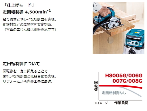 仕上げモード 「定回転制御」4,500min-1 定回転制御で、粘り強さとキレイな切断面を実現。