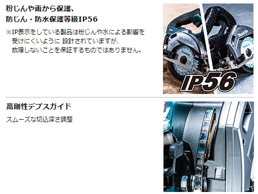■粉じんや雨を防ぐ防じん・防水保護等級「IP56」 本機はもちろん、バッテリも対応。
