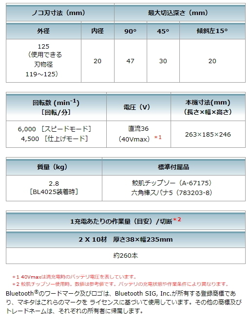 ノコ刃寸法 外径125mm (使用できる刃物径119~125) 内径20mm