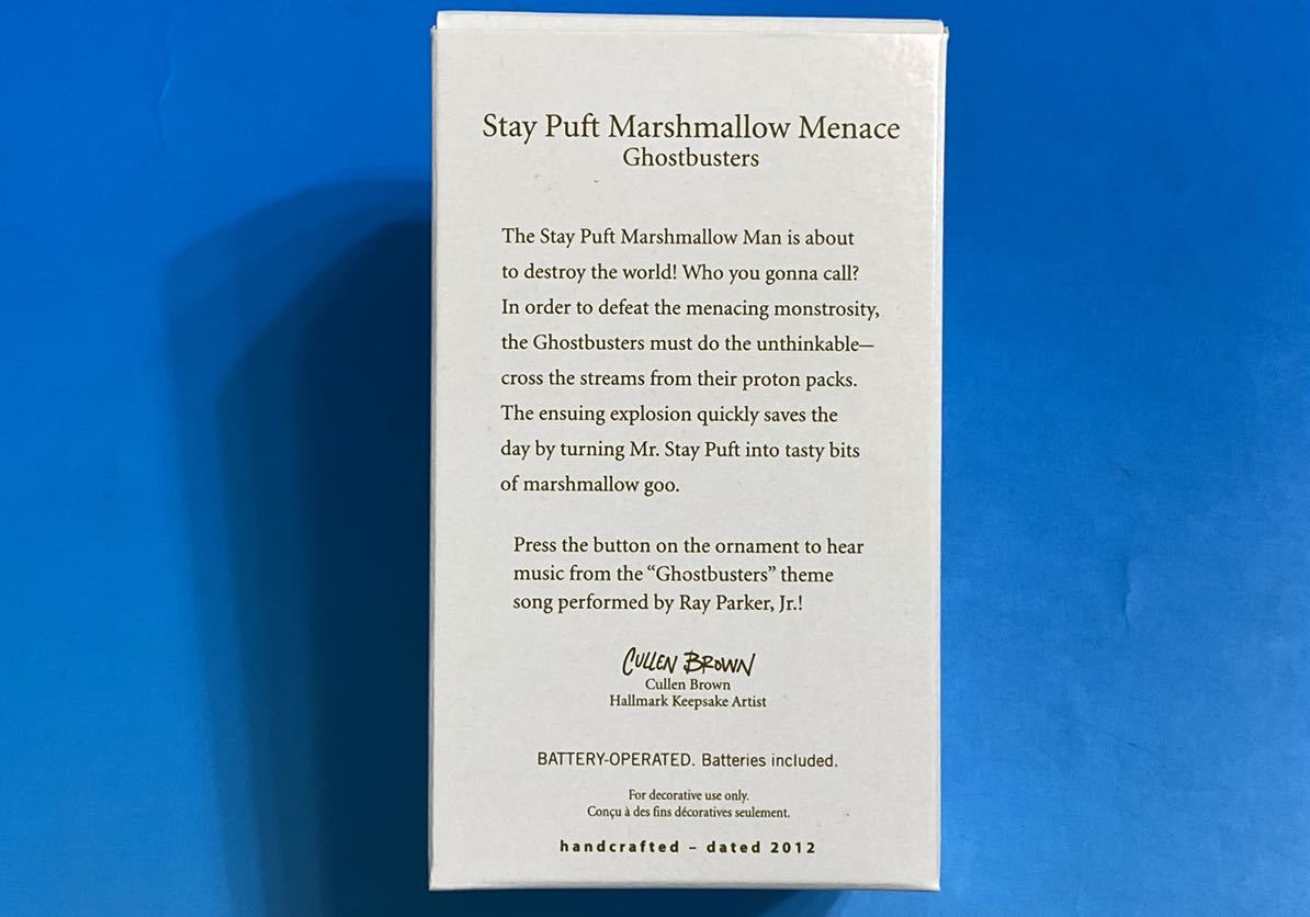 アメリカのホールマーク社の、映画ゴーストバスターズに登場するマシュマロマンのオーナメントです。