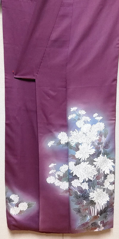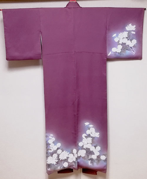 梅紫(少しグレー味のある赤紫色)地に、華やかな白の菊柄が描かれています。