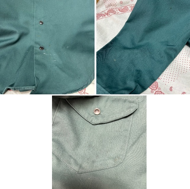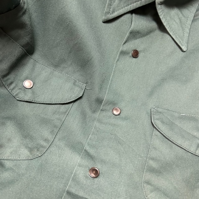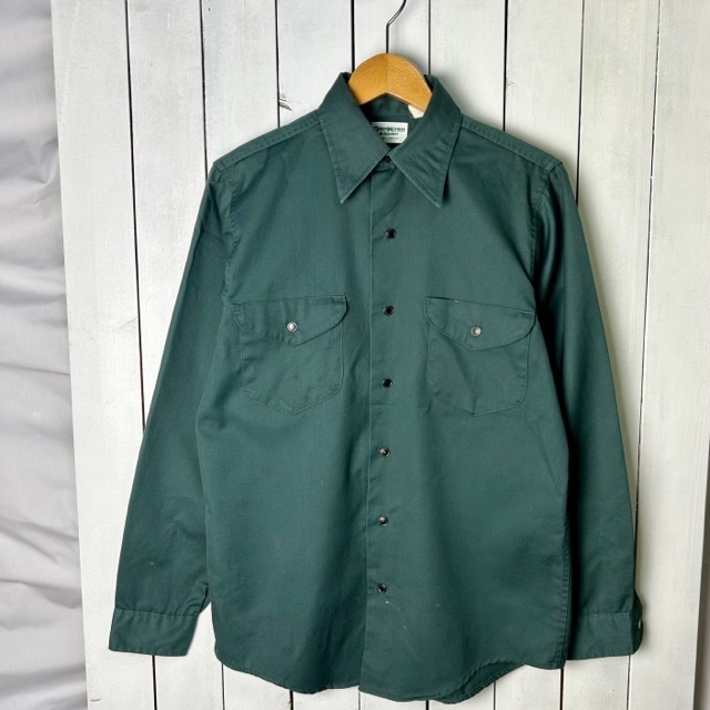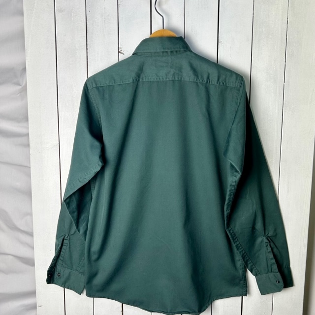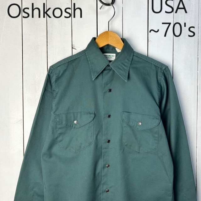 ●商品説明・・・アメリカ古着になります。60年代後半~70年代頃の緑タグのオシュコシュのオールド・ヴィンテージのワークシャツです。スナップボタンタイプになります。ユニオンチケットタグ付きのmade in USA (アメリカ製)になります。素材はポリとコットンの混紡のしっかりしたツイル生地で、色は深緑(ダークグリーン)です。サイズ表記は14 1/2で、やや大きめS~やや小さめM程度のサイズ感かと思います。