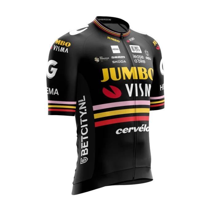 この限定ジャージは、チームユンボ・ヴィスマがジロ・デ・イタリア(プリモシュ・ログリッチ)、ツール・ド・フランス(ヨナス・ヴィンゲゴー)、ブエルタ・ア・エスパーニャ(セップ・クス)でリーダージャージを獲得したことを象徴するピンク、イエロー、レッドの3色を取り込んだ特別なデザインです。